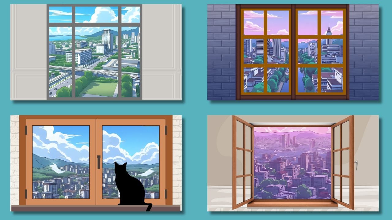 - 4 unique designs — each showcasing a different anime city vista through a window.