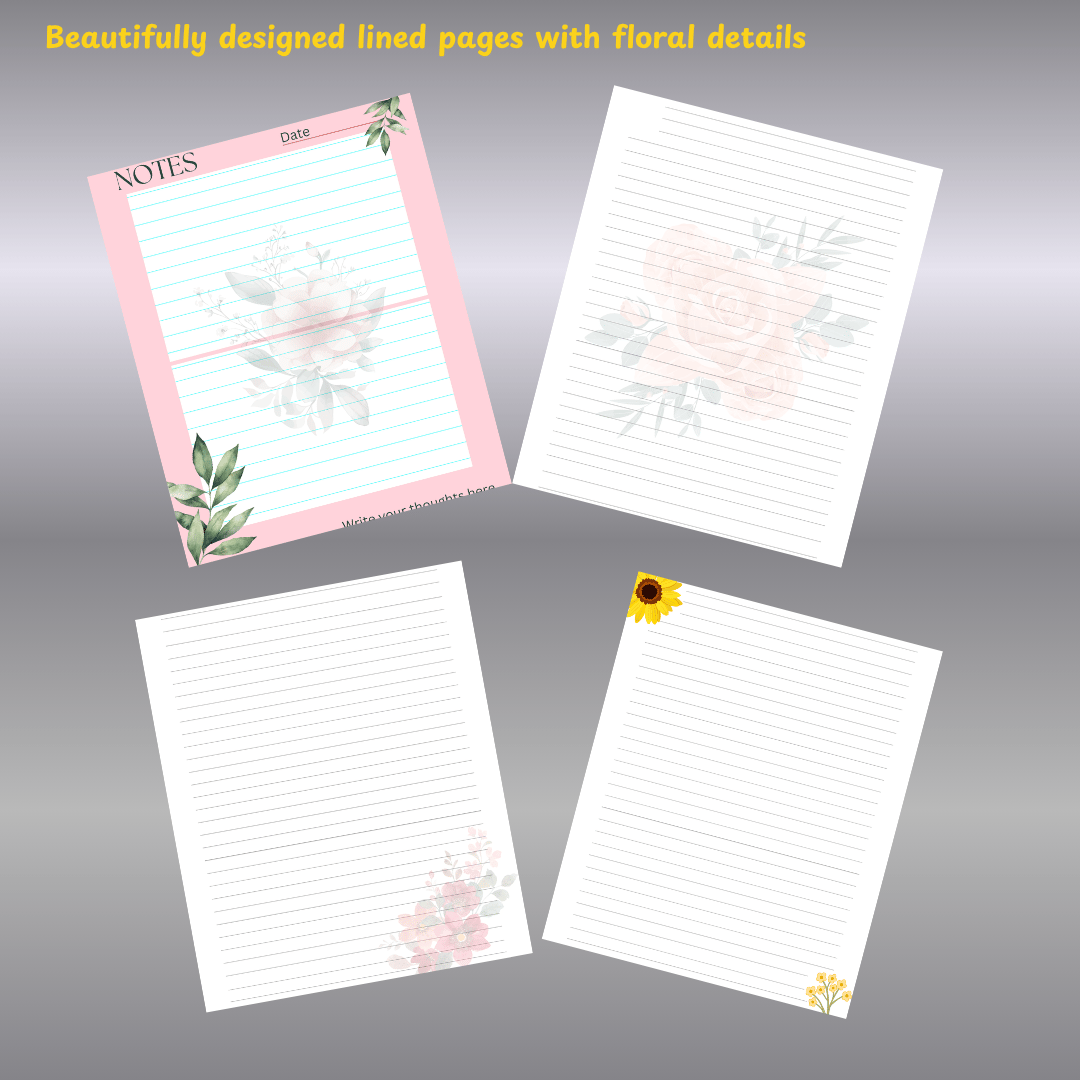 This printable notebook includes 122 lined pages, each page featuring a unique floral accent to make your writing experience fresh and enjoyable every time 🌸