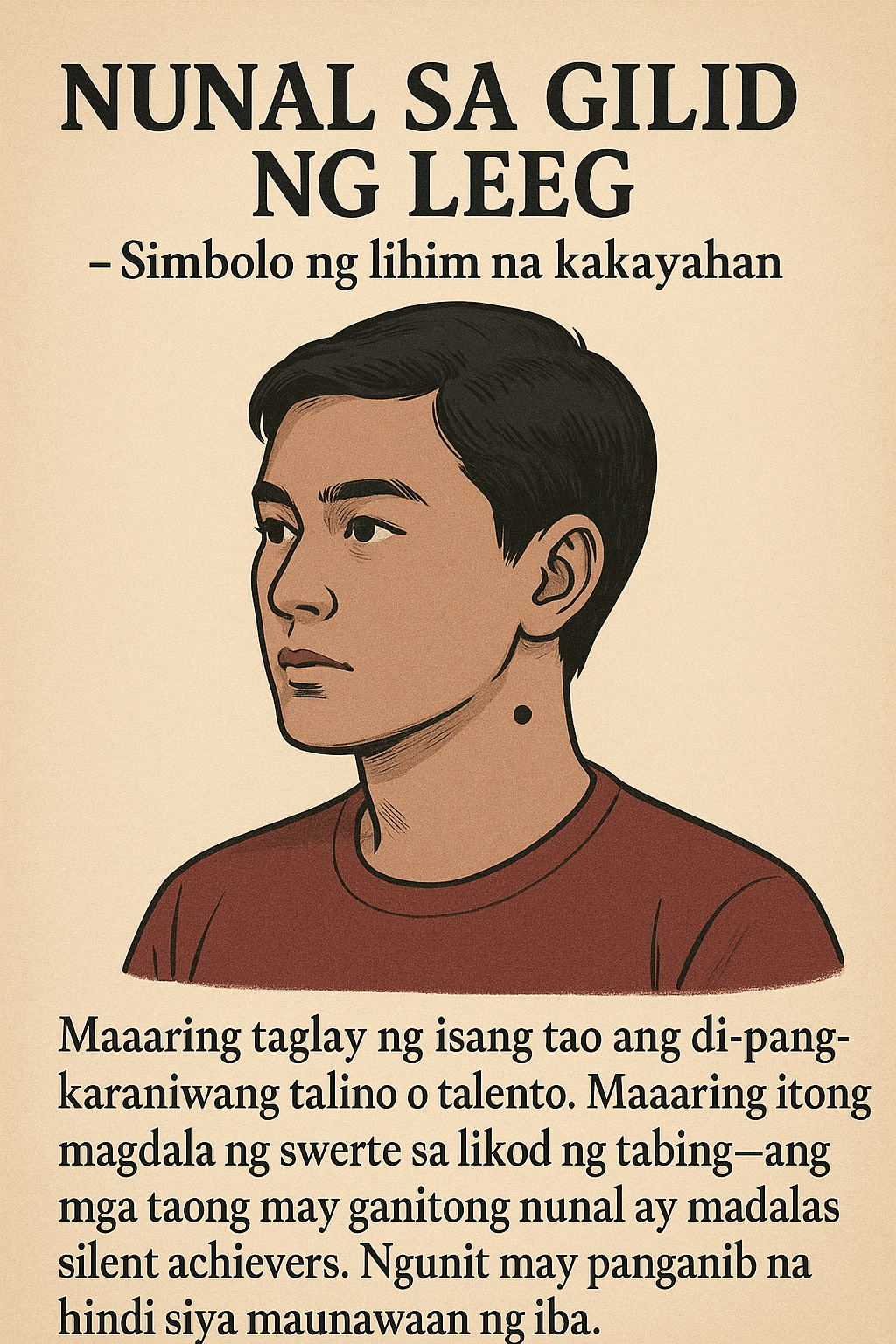 Sa tatlong bahaging pagkakahati—Upper Body, Midsection, at Lower Body—binibigyang liwanag ng aklat na ito ang koneksyon ng mga nunal sa personalidad, kalusugan, kapalaran, at maging sa mga panganib o biyaya na maaaring abangan sa buhay. Gamit ang paniniwalang ugat sa sinaunang kulturang Pilipino, Tsino, at Hindu, ang bawat paliwanag ay isinulat sa wikang nauunawaan ng kaluluwa at isipan.