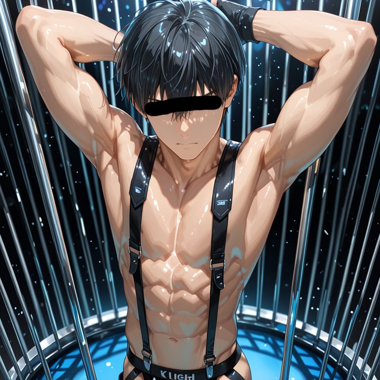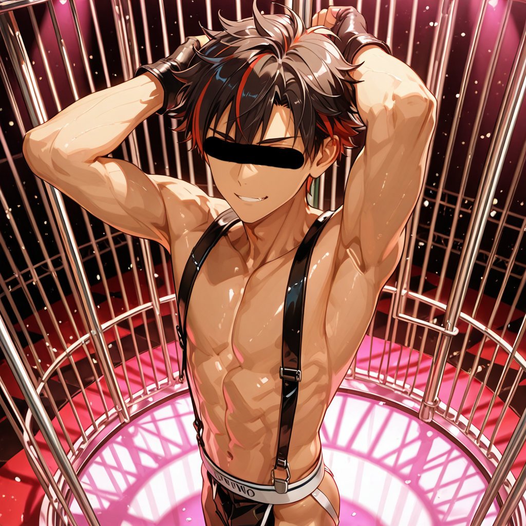 男性ショーダンサーをテーマに、ジョックストラップとサスペンダーを着せて、ポールと鳥かごをテーマに、キャラクターの魅力を存分に表現しました。