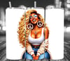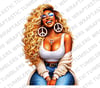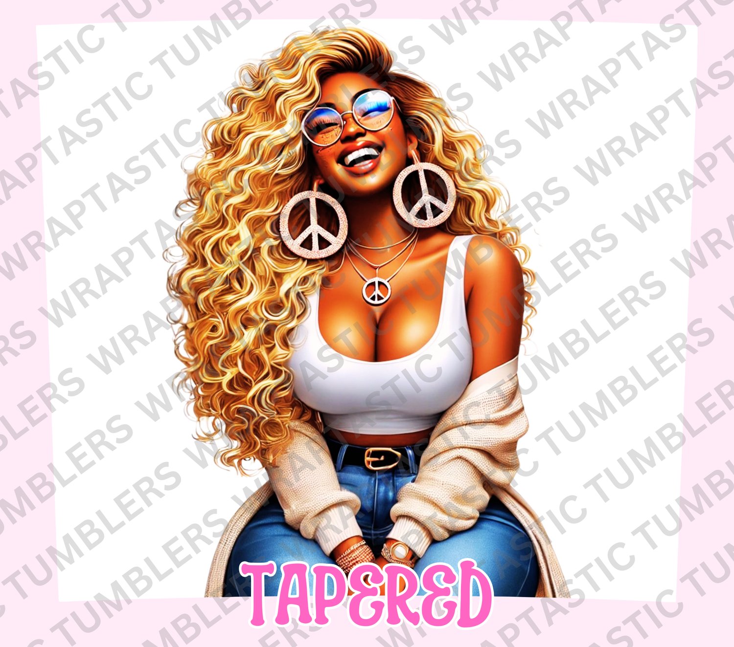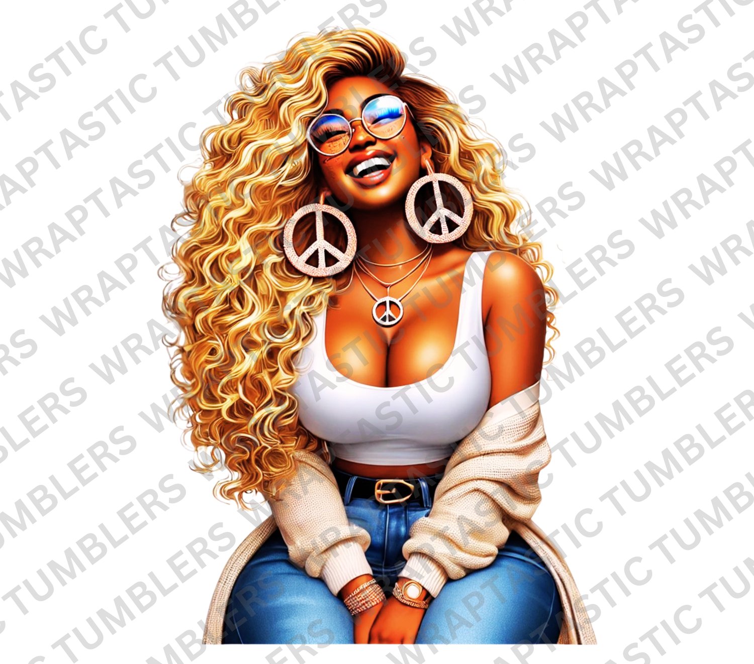 A radiant design showcasing a confident woman with long, flowing blonde curls, peace sign earrings, and a joyful, carefree smile. This artwork blends retro-chic vibes with modern fashion, capturing effortless beauty, positivity, and bold feminine energy. Warm golden tones, soft denim accents, and polished details create a stylish and uplifting aesthetic. ✨✌🏽