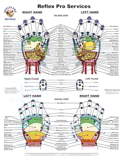 This Reflex Pro Handchart is a professional-grade reflexology chart designed for reflexologists, massage therapists, holistic health practitioners, and wellness enthusiasts. The detailed plantar, dorsal, lateral, and medial views of the hand provide clear reflex point locations, making it an essential tool for both practitioners and students.
