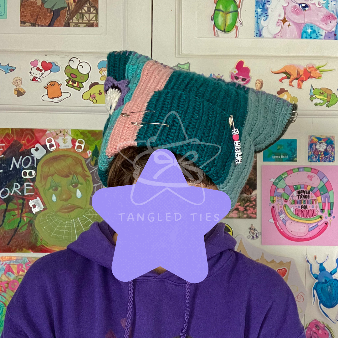 Inspired by Monster High, the hat features muted teal and green stripes, and accents of lavender and pink for a creepy cute vibe.