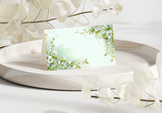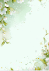 A soft watercolor green floral wedding invitation suite featuring delicate white blossoms and airy botanical details.