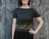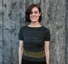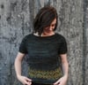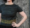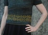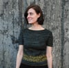 Arte Nuova is a lightweight, draped top, perfect for warmer months. It is worked top-down, in the round, featuring a hybrid raglan / yoke construction. Chevron cables run along each shoulder and down the outside of the sleeves. A section of intricate colourwork, which takes inspiration from Art Deco and Art Nouveau design eras, decorates the waist. This is an engaging, motivating knit that yields an elegant and versatile finished garment.