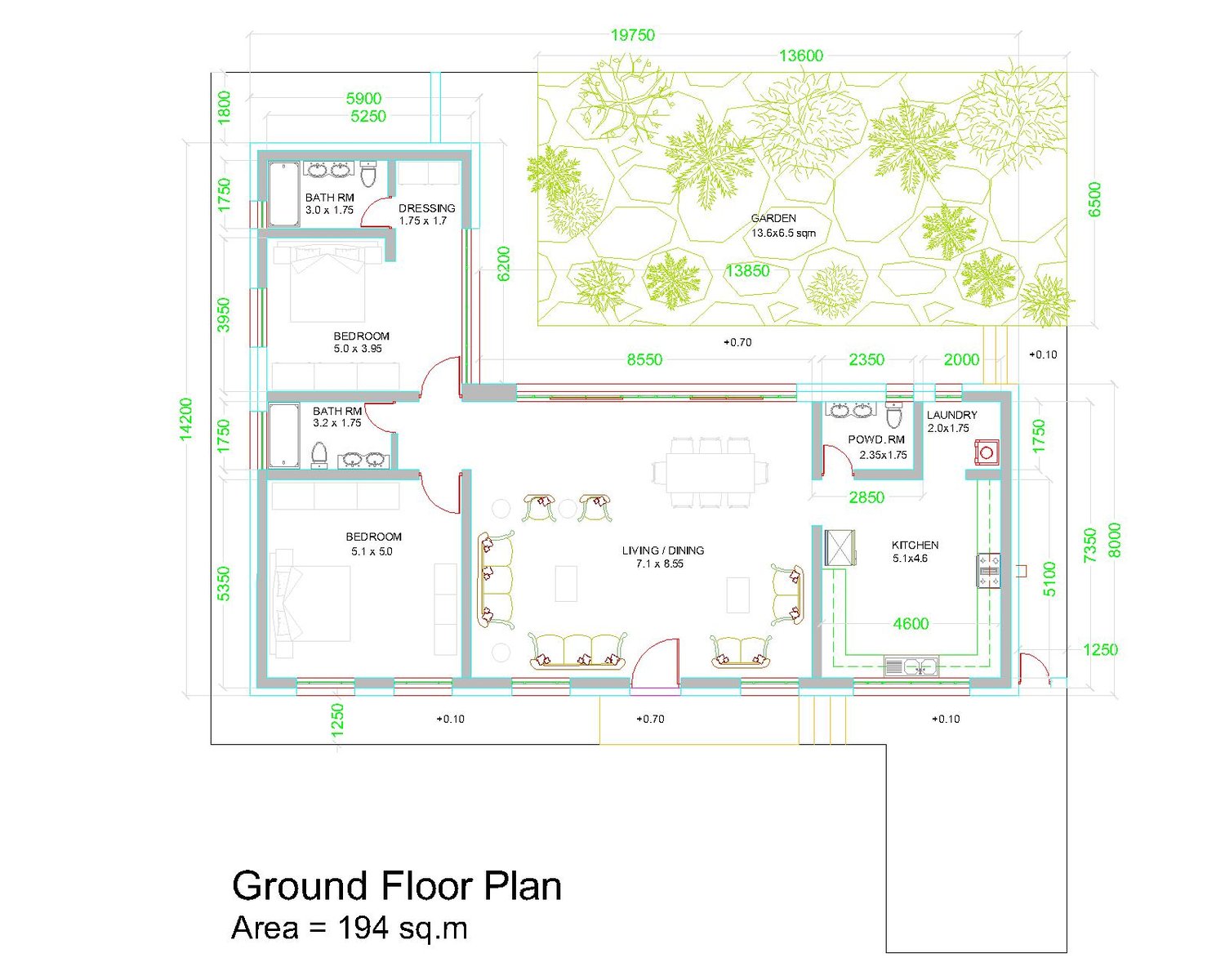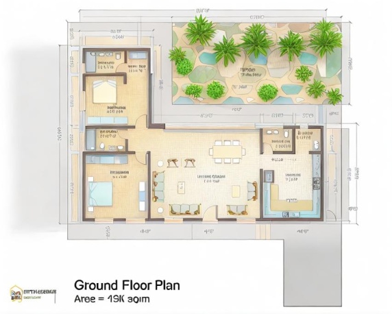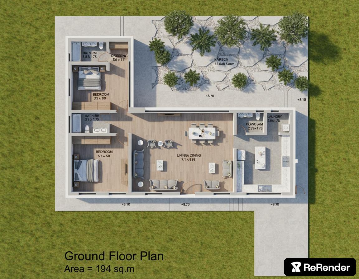 This serene one-story biophilic home of 194 sqm features a clean L-shaped layout that embraces a lush central courtyard. The design seamlessly merges indoor and outdoor living, with floor-to-ceiling glass panels opening toward the garden, allowing natural light and greenery to flow into every room.