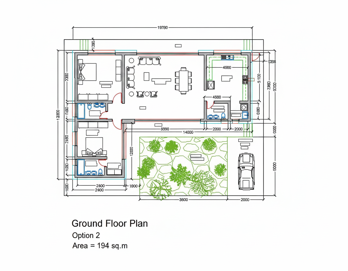 Additionally, an optional mirrored version of the floor plan is available, offering the flexibility to place the garden at the front of the house. This option also includes the addition of a carport, providing a practical yet stylish entrance. The mirrored design maintains the same seamless flow between indoor and outdoor spaces, but with the garden and outdoor living area positioned at the front, creating a welcoming view from the street. Whether you prefer the courtyard in the center or a garden-facing entrance, this versatile design can be customized to fit your lifestyle and preferences.