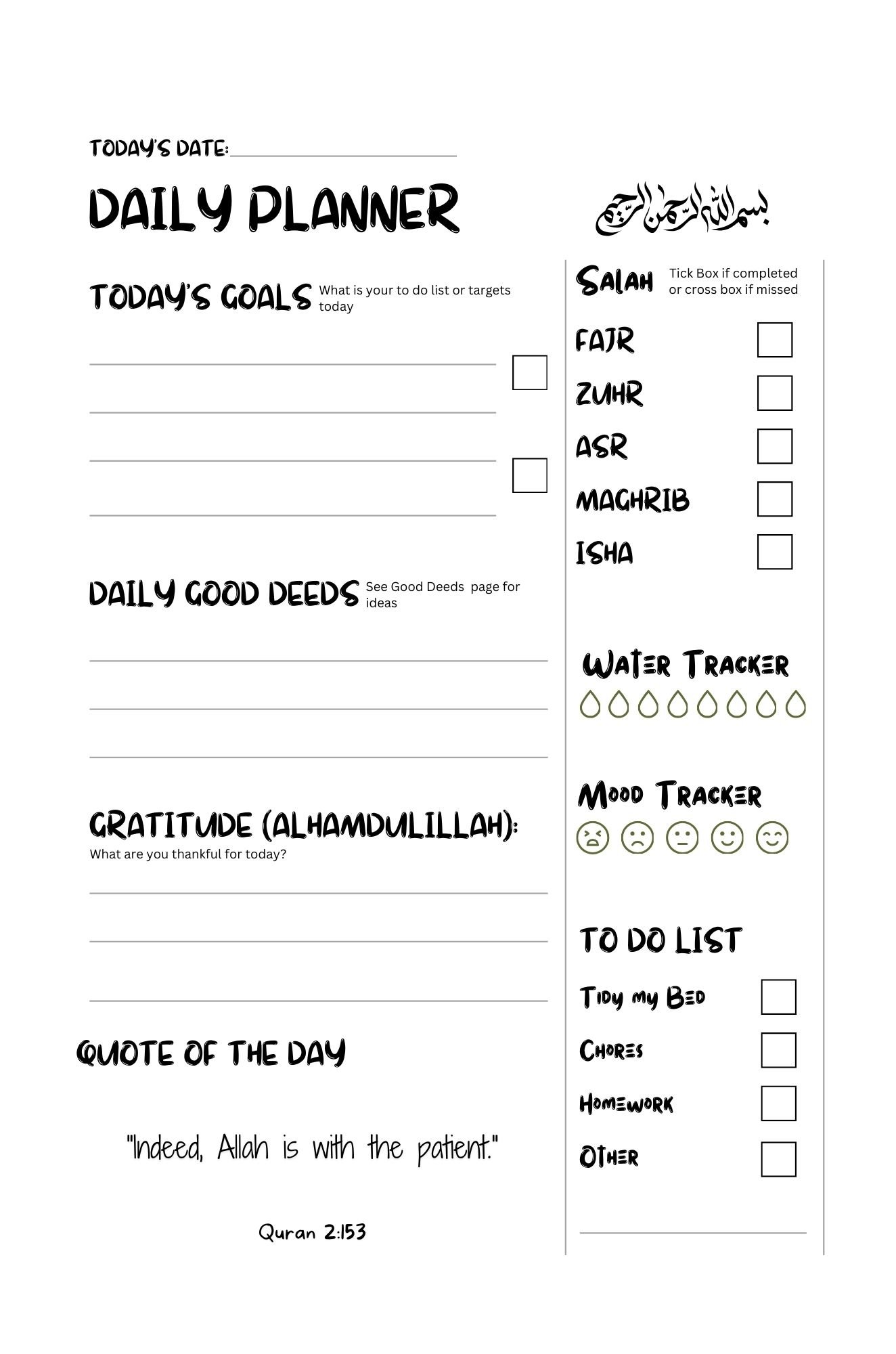 My Journal with Inspirational Quotes from the Qur’an and Hadith - Daily and weekly pages: Salah, Water and Good deeds tracker - Digital file