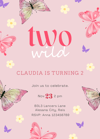 Butterfly Two Wild Invite Boho Second Birthday Party Invitation, Two Wild Digital Birthday Party Invite for girl, Second Birthday Invitation 2nd Birthday Party Invite Minimalist Two-Year-Old Birthday Invitation Editable Digital Second Birthday Invite for Girl