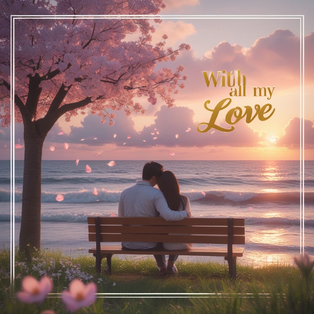 A beautiful postcard-style image symbolizing love — a romantic sunset scene by the ocean with golden light reflecting on gentle waves. In the foreground, a couple sitting close together on a wooden bench under a blooming cherry blossom tree, soft petals drifting through the air. The sky is painted in warm shades of pink, peach, and lavender with fluffy clouds glowing in the evening light.