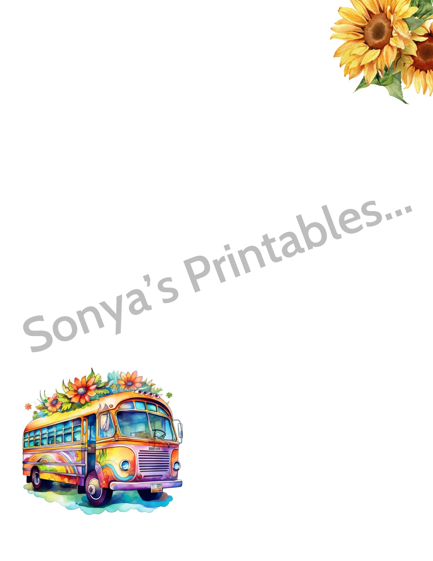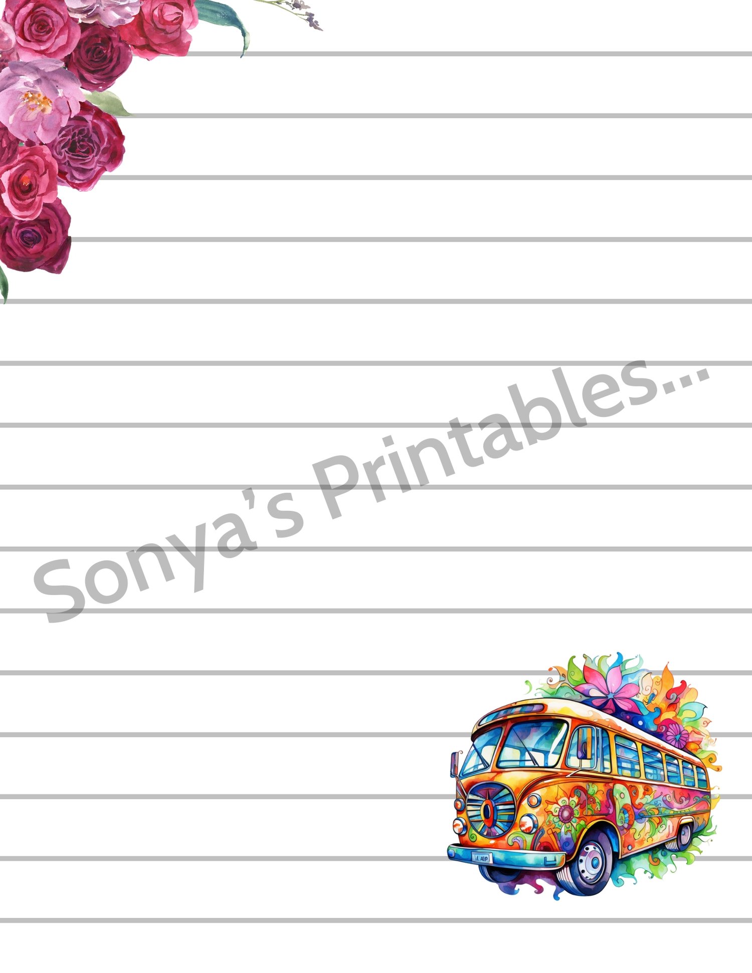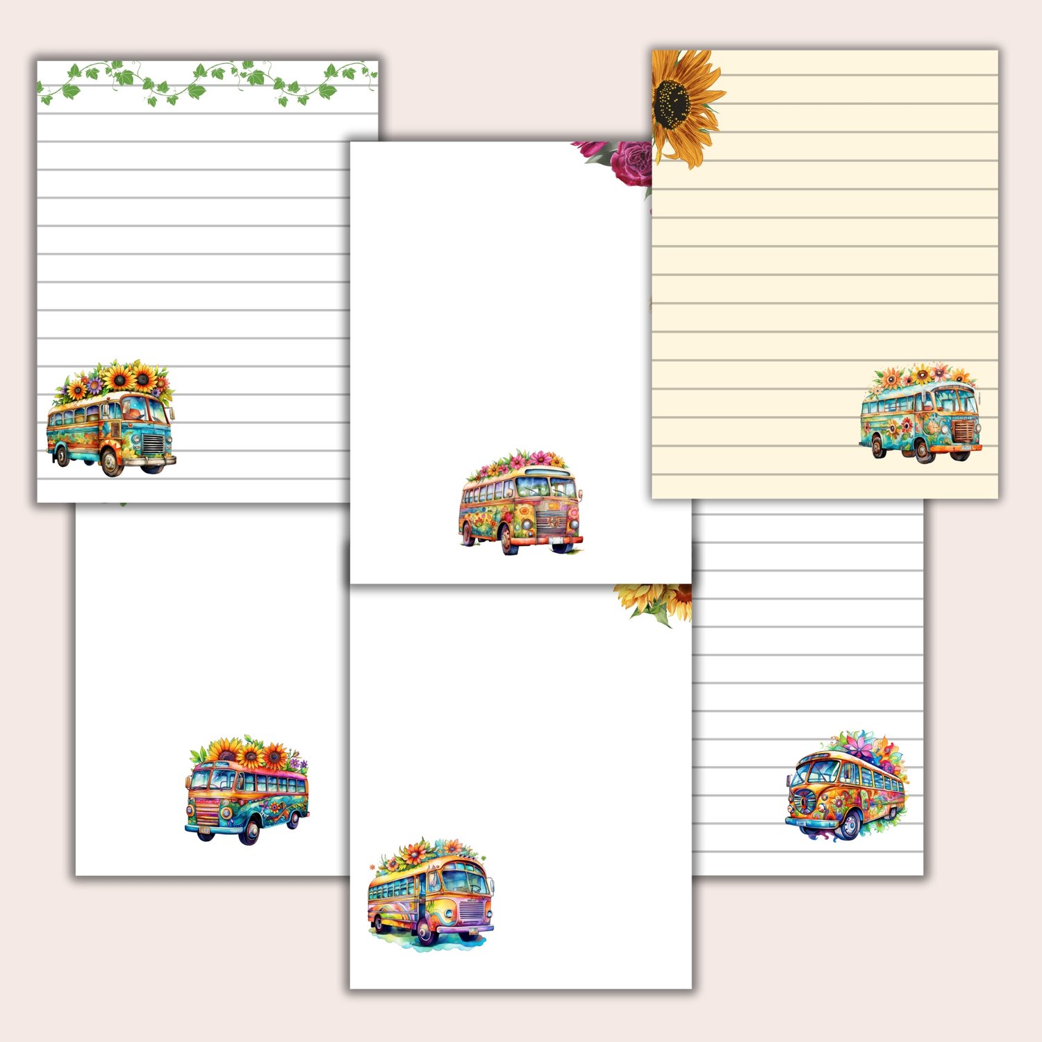 Note: This is a digital download. No physical item will be shipped. You'll recieve 6 unique sheets of Floral Hippie School Bus Stationery.