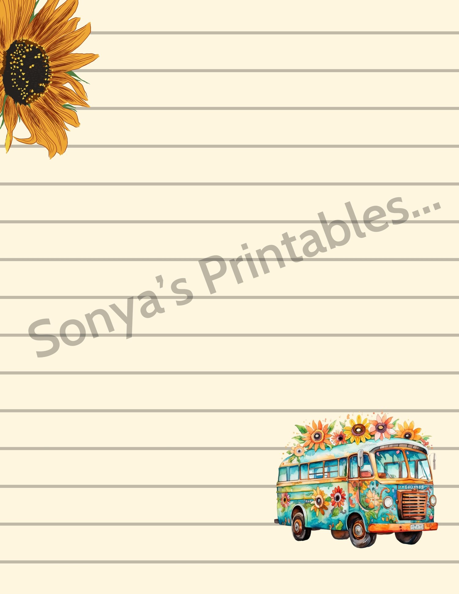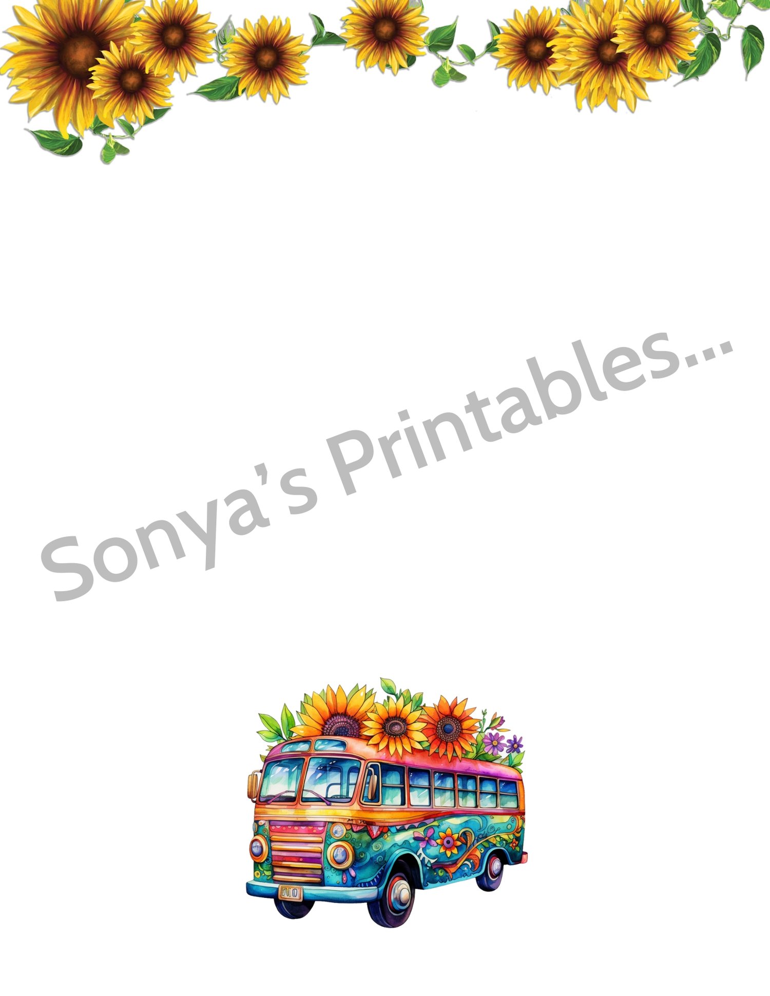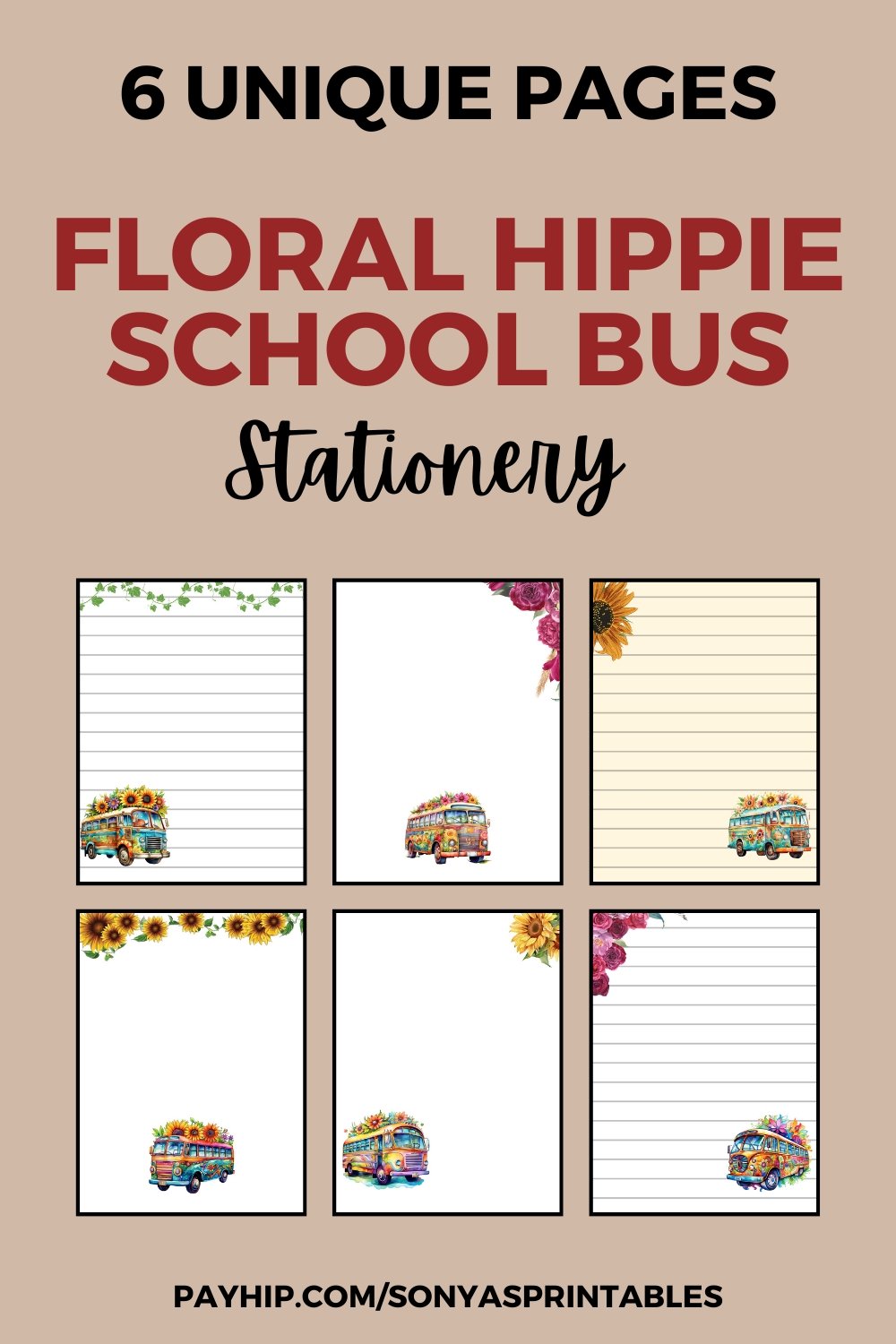 Note: This is a digital download. No physical item will be shipped. You'll recieve 6 unique sheets of Floral Hippie School Bus Stationery.