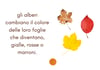 - 7 pagine introduttive illustrate, con testi semplici e chiari sull’arrivo dell’autunno, i cambiamenti del clima, gli alberi, gli animali e i frutti di stagione.