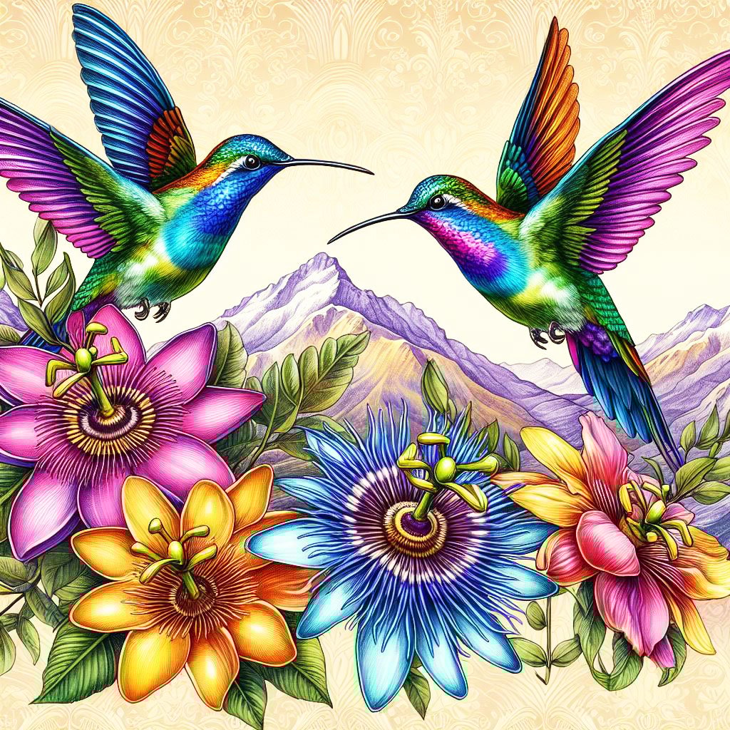 Beautiful & colourful humming birds on bright passion flowers with an embossed gold background.