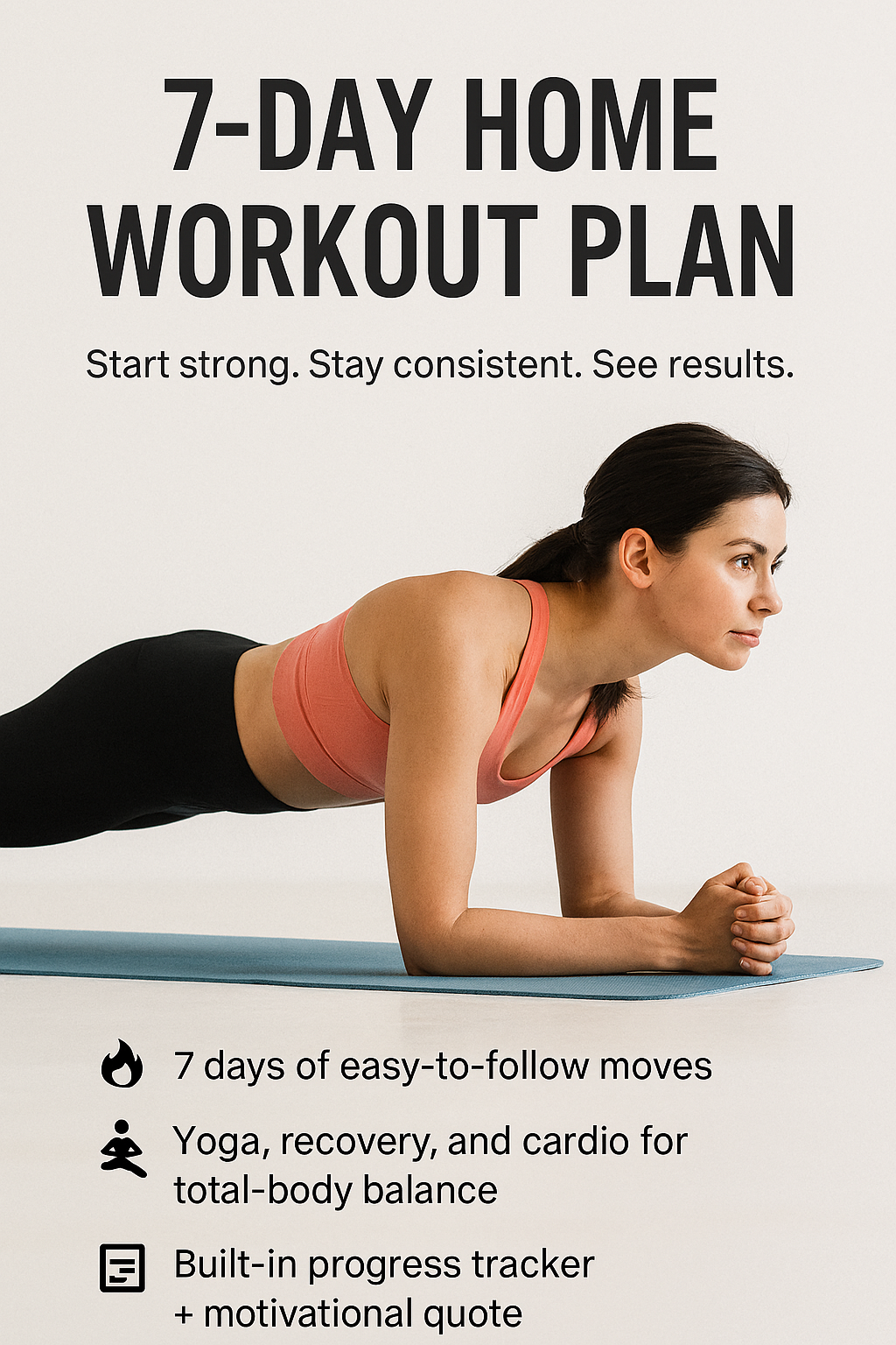 Introducing the 7-Day Home Workout Plan. We've eliminated every excuse. No equipment, no long hours, no confusion. Just 7 days of guided, achievable workouts designed to build momentum and deliver visible results.