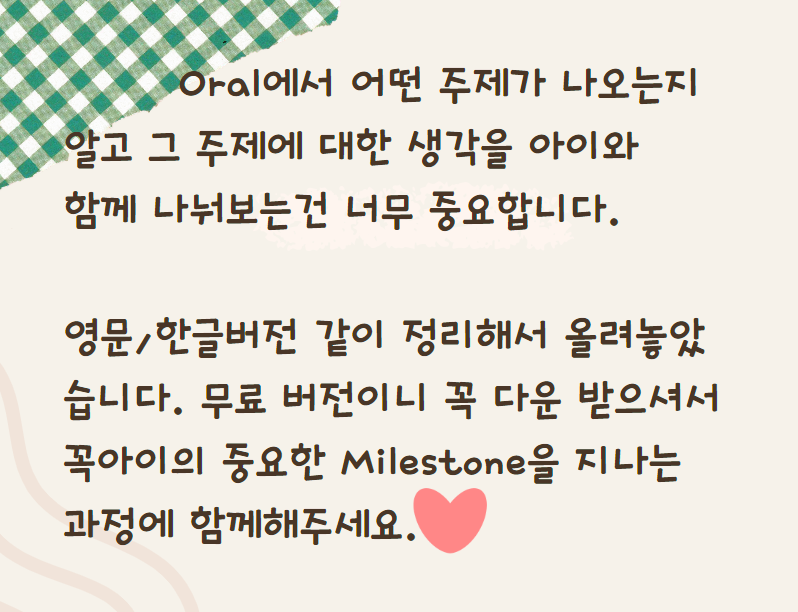 영어와 한글 버전이 모두 포함되어 있으니, 아이들에게 어떤 주제로 생각하게 할지, 주말에 어떤 경험을 쌓아줄지 미리 파악해보시면 좋을 것 같습니다.