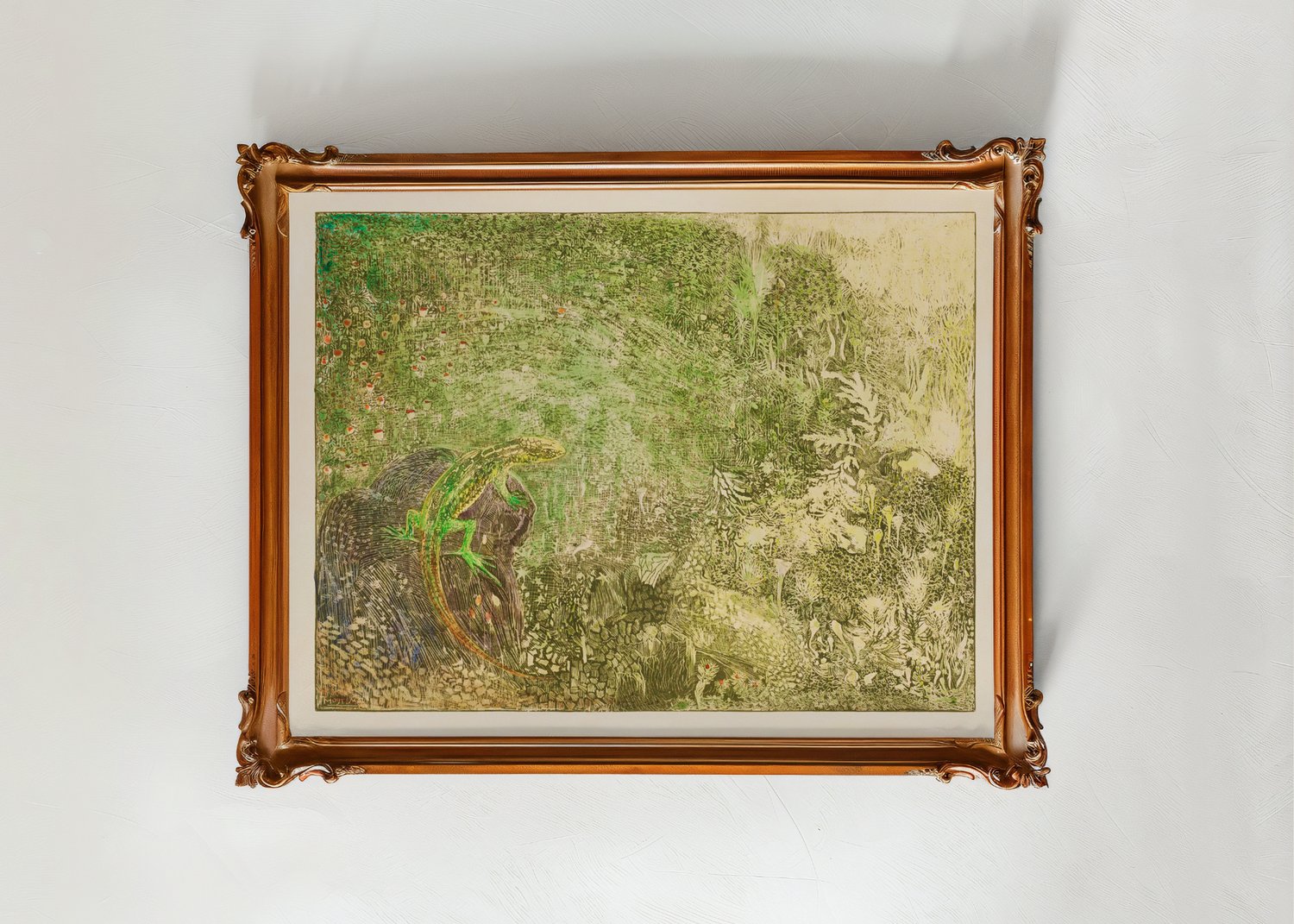 Lizard on a Stone— Quiet as a shadow, the lizard rests—still and sun-warmed atop a weathered stone. In Lizard on a Stone, Theo Van Hoytema captures a fleeting, almost meditative moment from the natural world. With his signature softness and gentle detailing, he invites us to see the grace in the ordinary: the curve of a tail, the texture of earth, the hush of stillness in the sun. A humble scene, rendered with reverence.