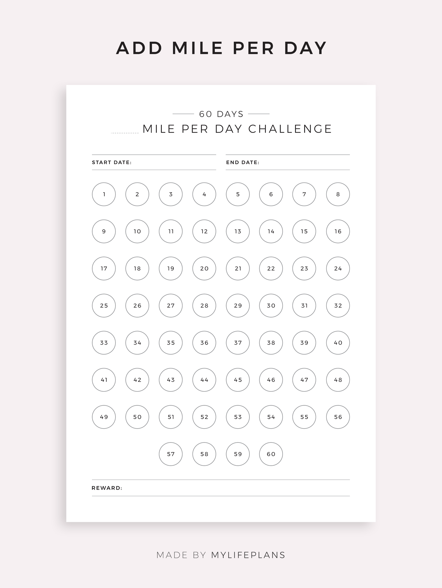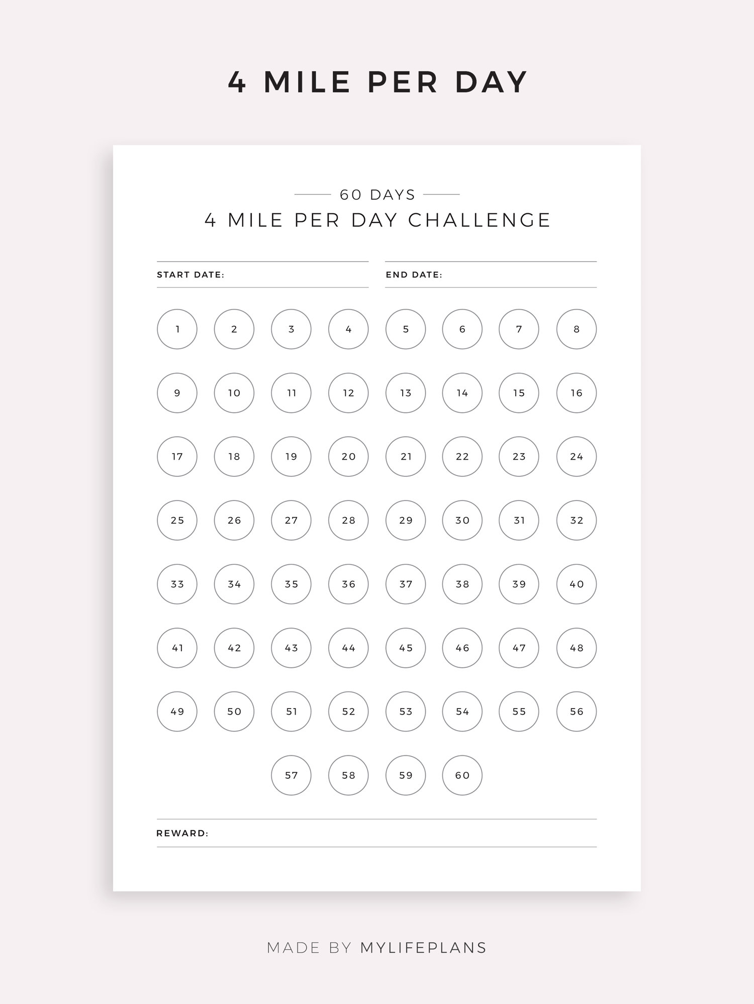 This is a printable 60 day running or walking challenge — just download, print, and start using it right away.