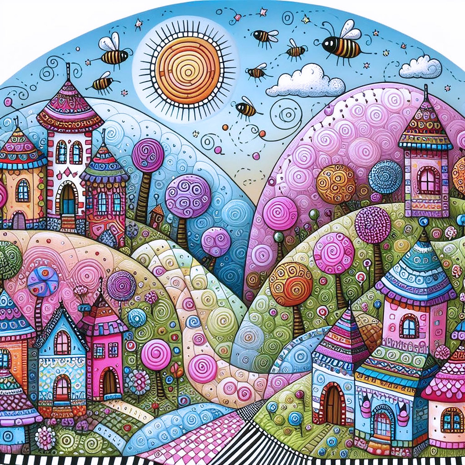 Whimsical Worlds of Houses & Hills 1 Patterned houses & hills, curly trees 7 Bees..