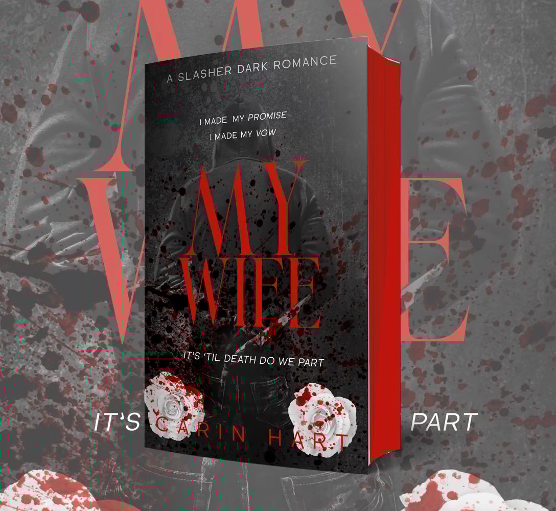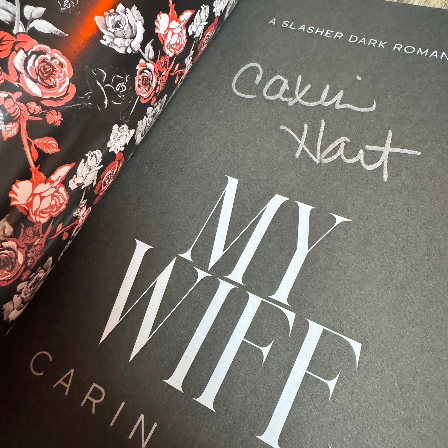 This is a signed copy of the collector's edition paperback version of My Wife by Carin Hart. It is a 5.5x8.5 trim and has a red-foiled cover, duplex inner cover, black pages/white text, and red-foiled edges.