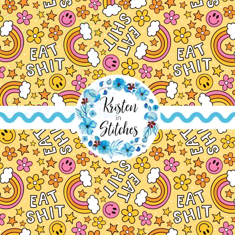 Eat Shit sarcastic pattern with flowers, happy faces and rainbows.