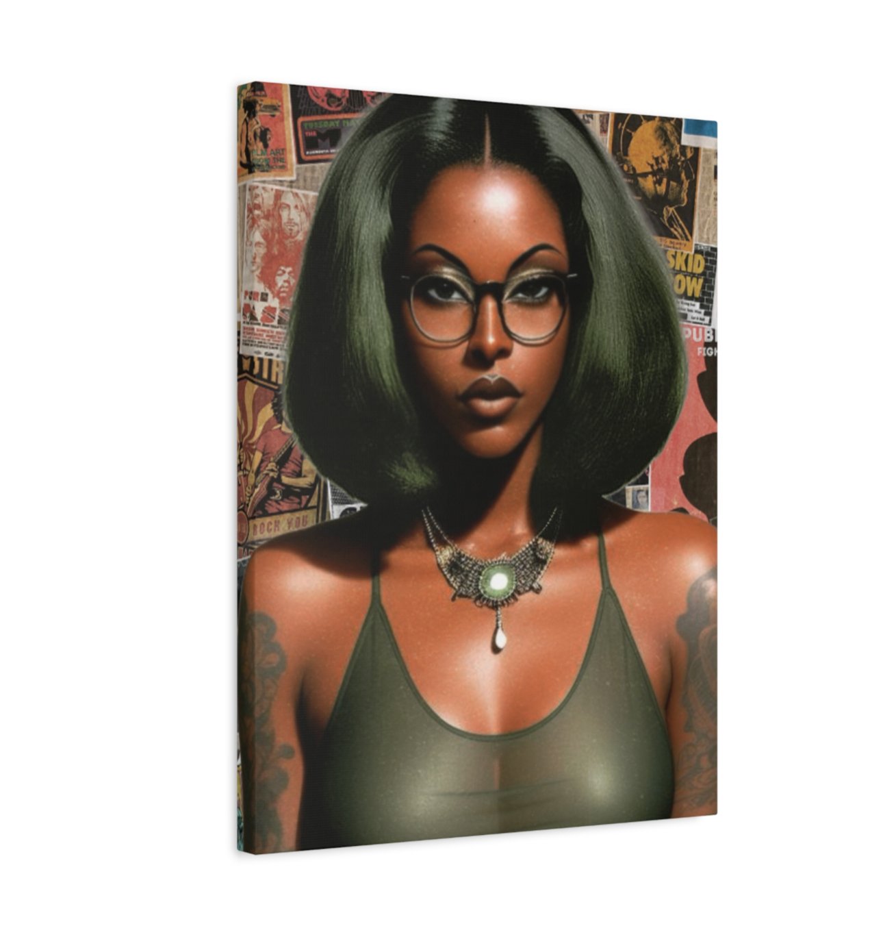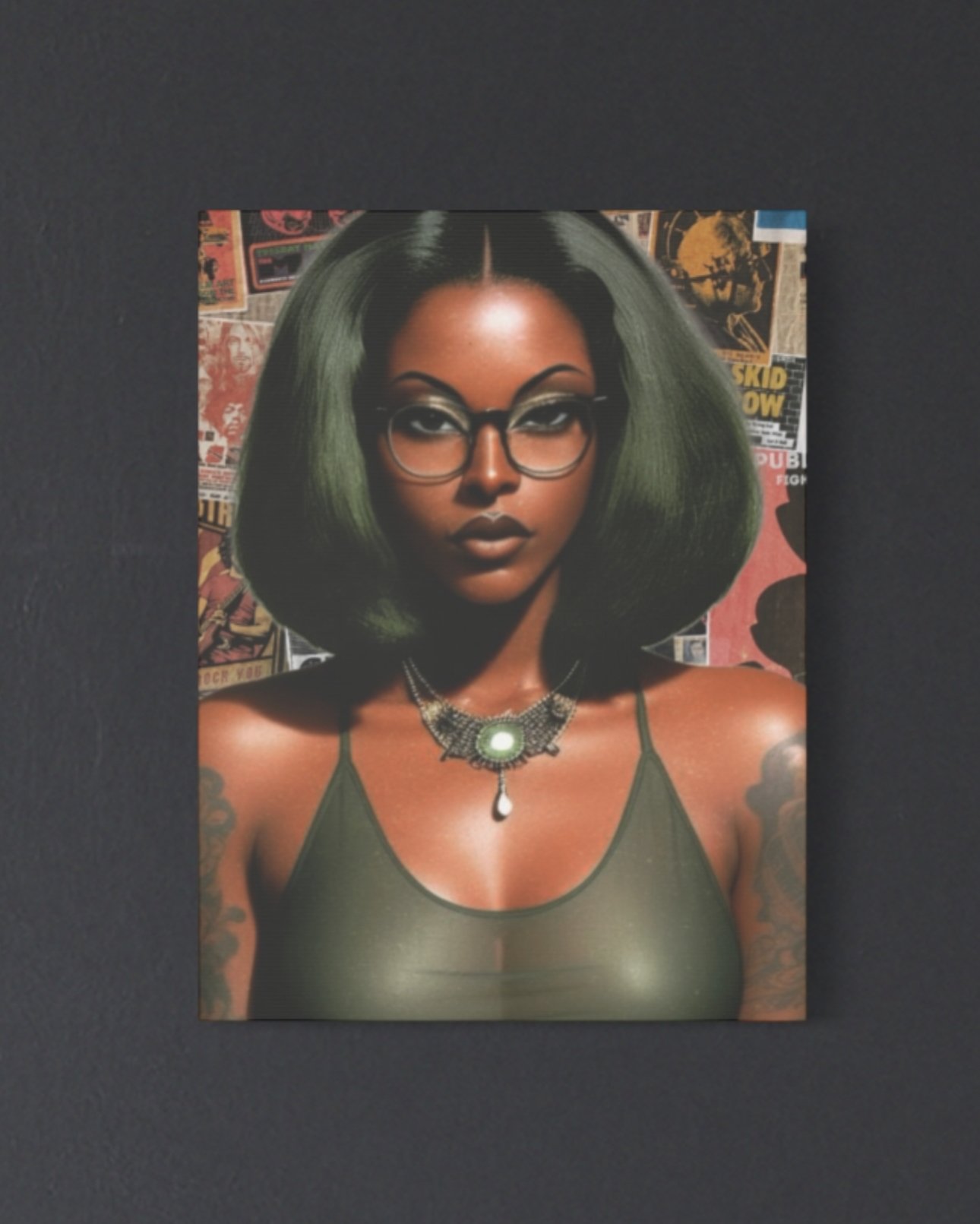 Step into the bold and rebellious spirit of the 1970s with Emerald Rebellion, an 18x24 matte stretched canvas that fuses vintage punk aesthetics with modern luxury. Featuring an enigmatic muse set against a backdrop of retro posters, this striking digital artwork radiates confidence, mystery, and unapologetic individuality.