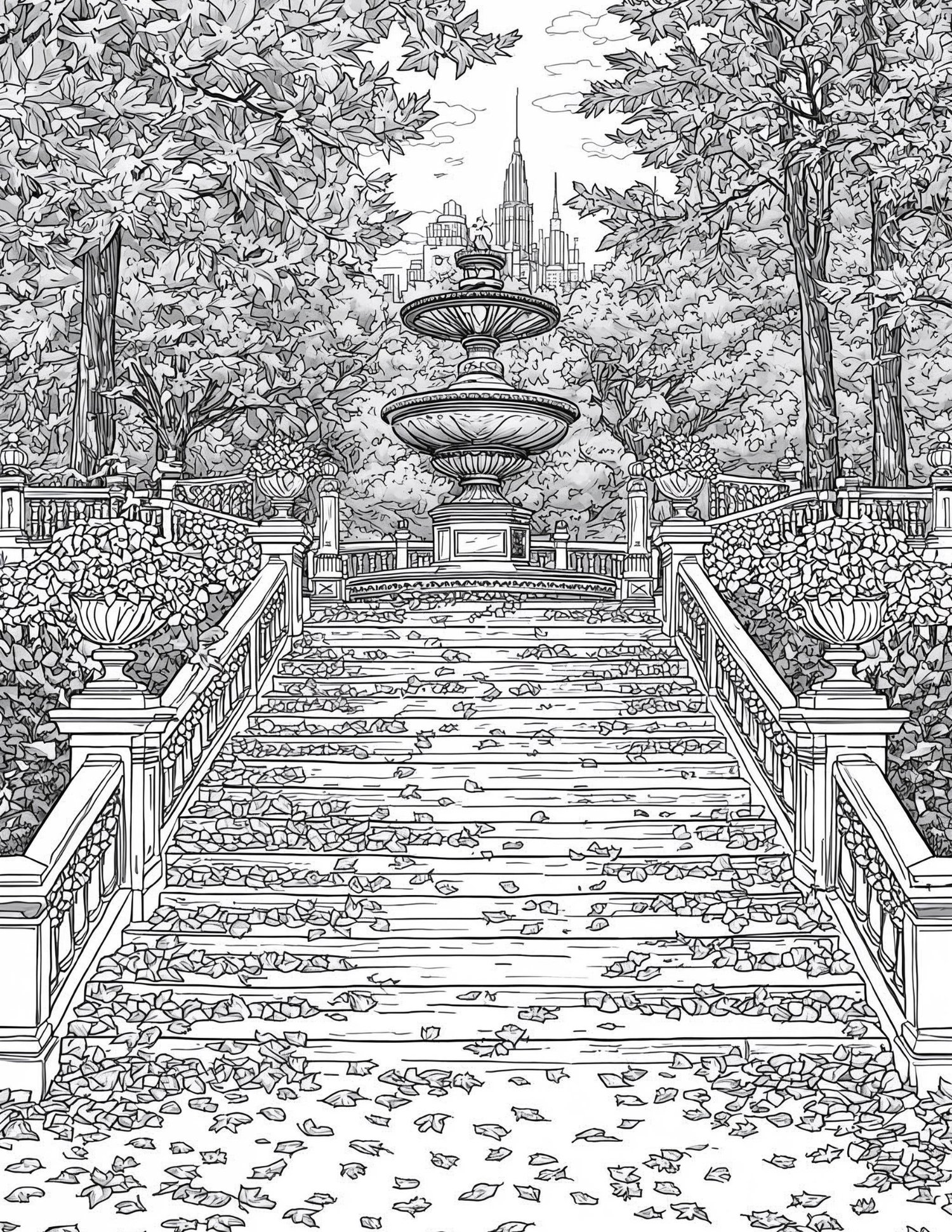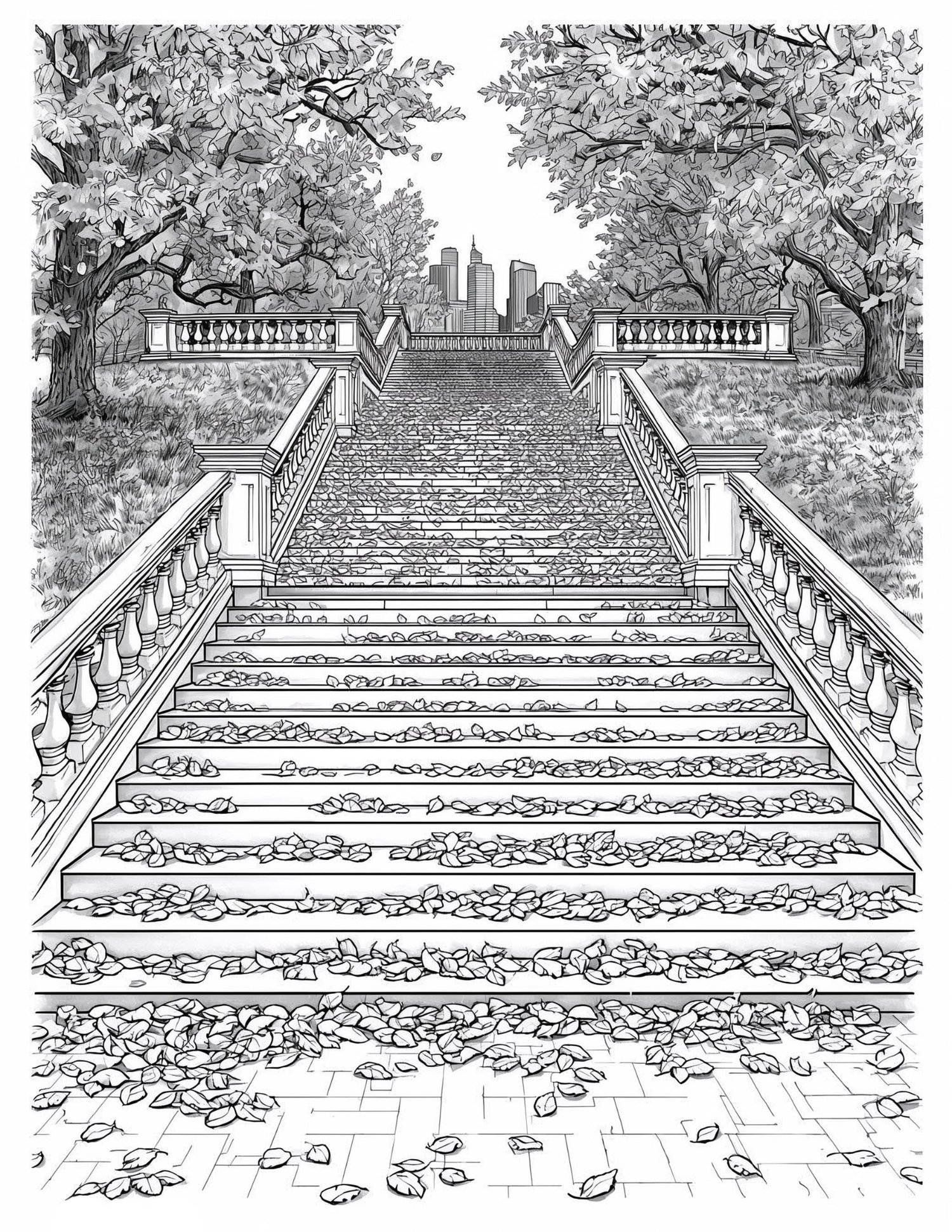 This unique coloring book invites you to explore "The Engraved Autumn Solitude" through 63 exquisite pages of professional line art. Each illustration, presented in a highly detailed Wood Engraving Style, captures the magic of the fall season—from vast, leaf-covered avenues to elegant city architecture visible through the trees.