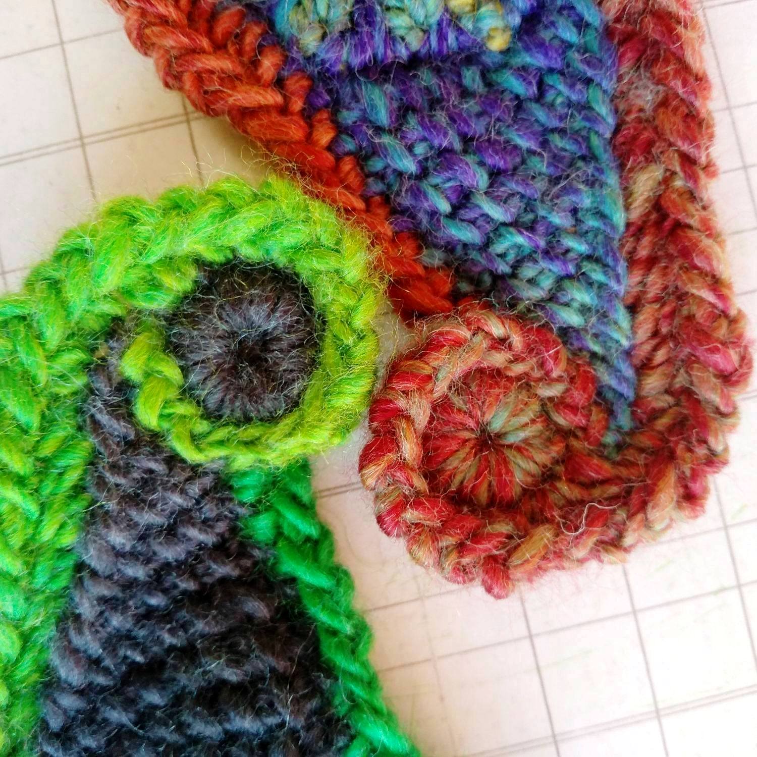 For these samples, it is best to use multi-colored yarn or several solid threads. Various types of wool, acrylic are suitable. DK size or thicker should be used for good texture. However, you can use thinner cotton threads that retain volume. The gauge doesn’t matter!