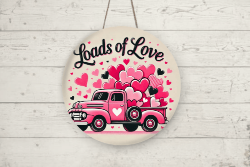 - One PNG file of the "Loads of Love Pink Valentine Truck" round door sign design, available for instant digital download.