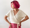 The top is worked at a DK weight gauge, and is very satisfying to knit. Stockinette and slipped stitches create flowy fabric that drapes beautifully. A tie at the bottom allows the wrap to perfectly hug your waist. An optional back strap supports the V-neck. Pattern contains both written instructions and charts.