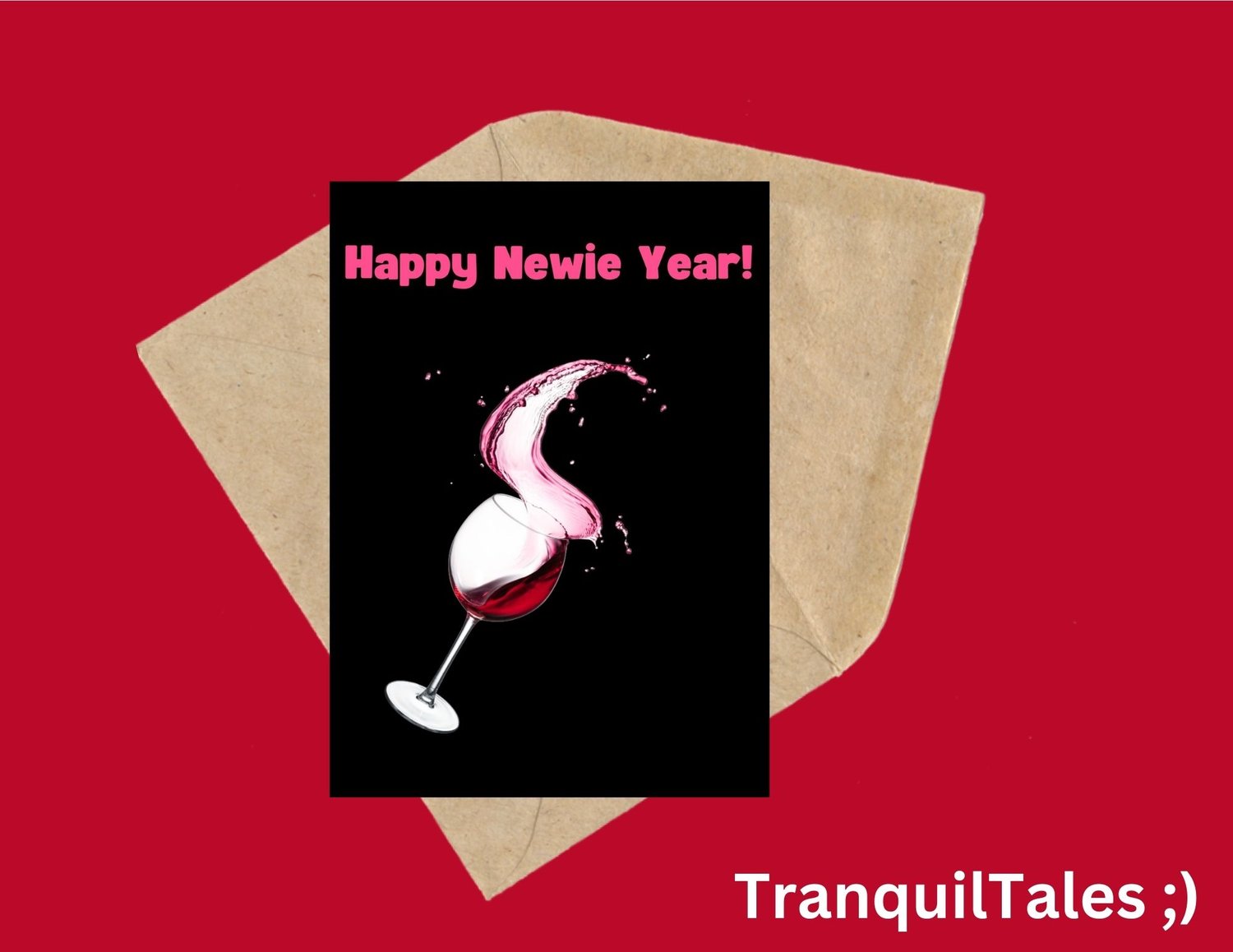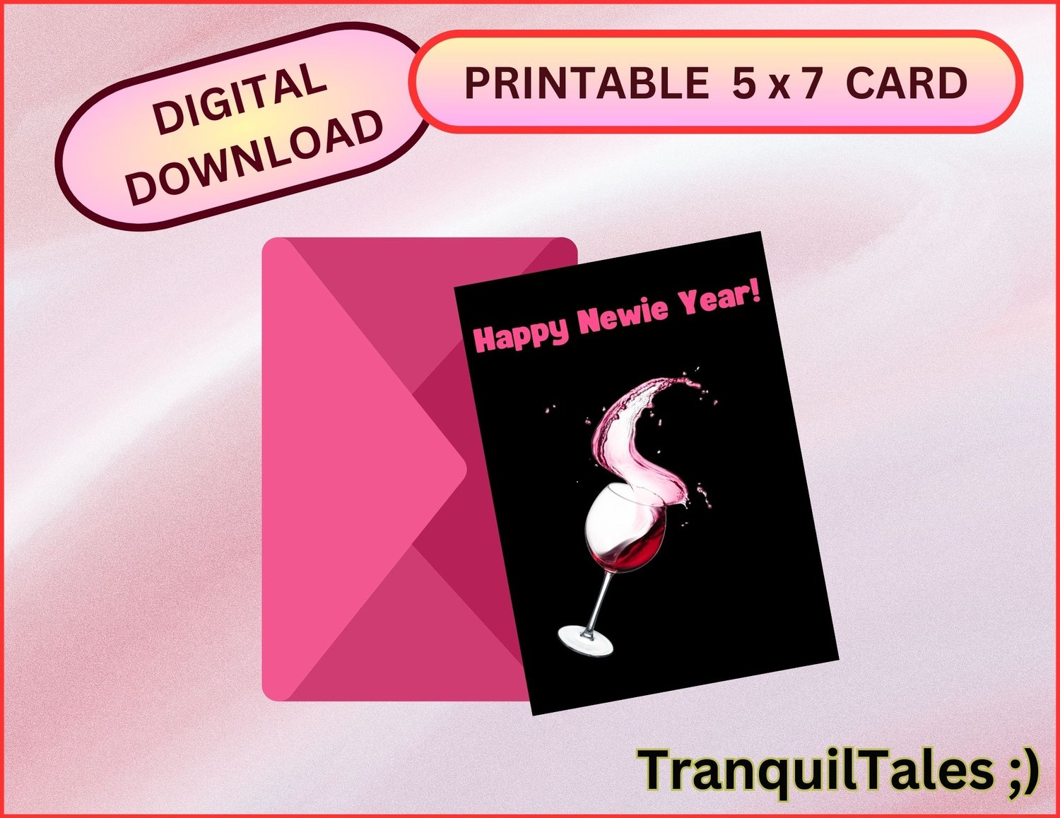 Happy Newie Year! Card - with a Glass of Red Wine & Joy - 5" x 7" inches - New Year card - PDF File