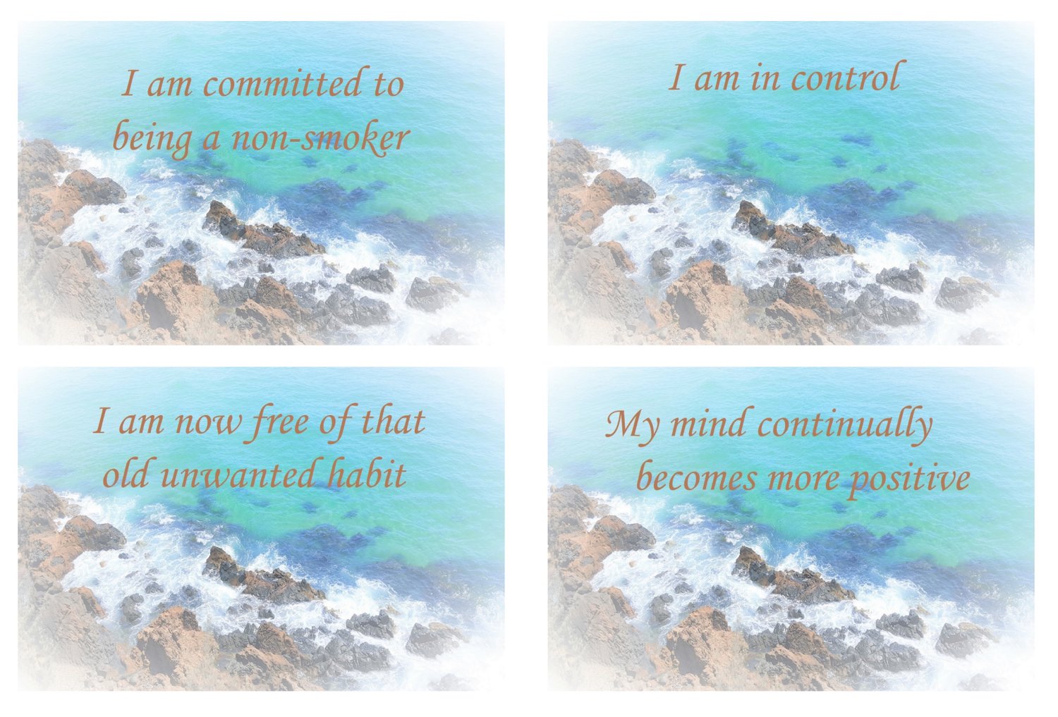Included in the PDF file are images for 20 printable affirmation cards, each has an affirmation with an ocean scene background.