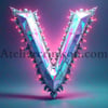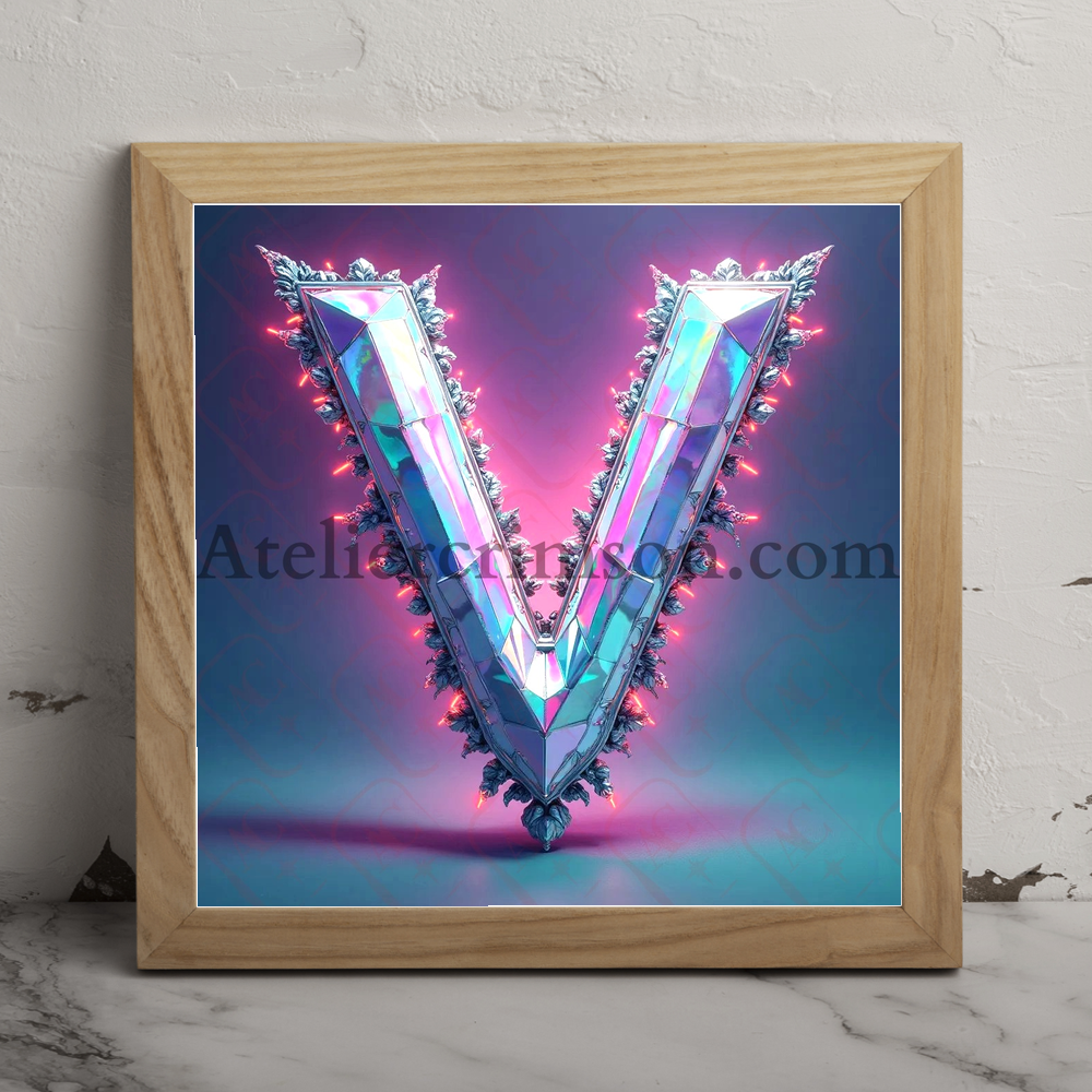 The letter V crystalline Retro Futuristic C A unique creation blending retro-futuristic aesthetics and geometric elegance. Each character is sculpted from iridescent crystals in vibrant, nostalgic hues, set in delicate silver filigree. Against a gradient background transitioning from deep purple to teal blue, this digital artwork captures the essence of 80s-inspired digital art with a touch of crystalline luxury. Perfect for typography enthusiasts, digital art lovers, and those who appreciate retro-futuristic aesthetics.