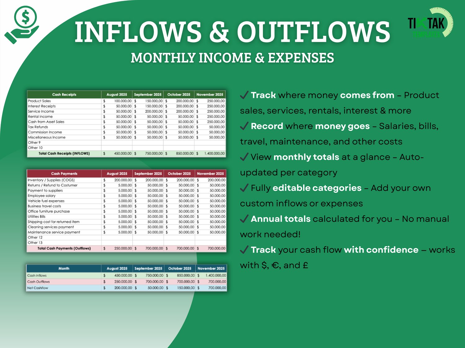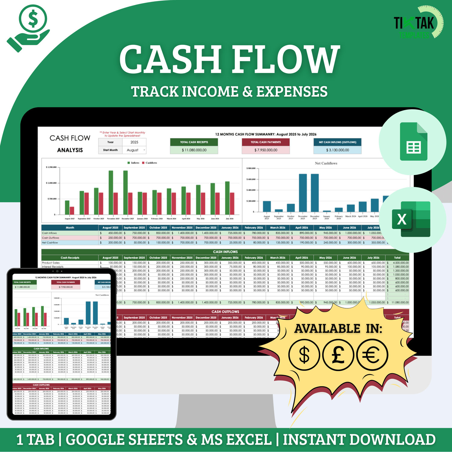 Cash Flow Tracker – Income & Expense Spreadsheet (Excel & Google Sheets)