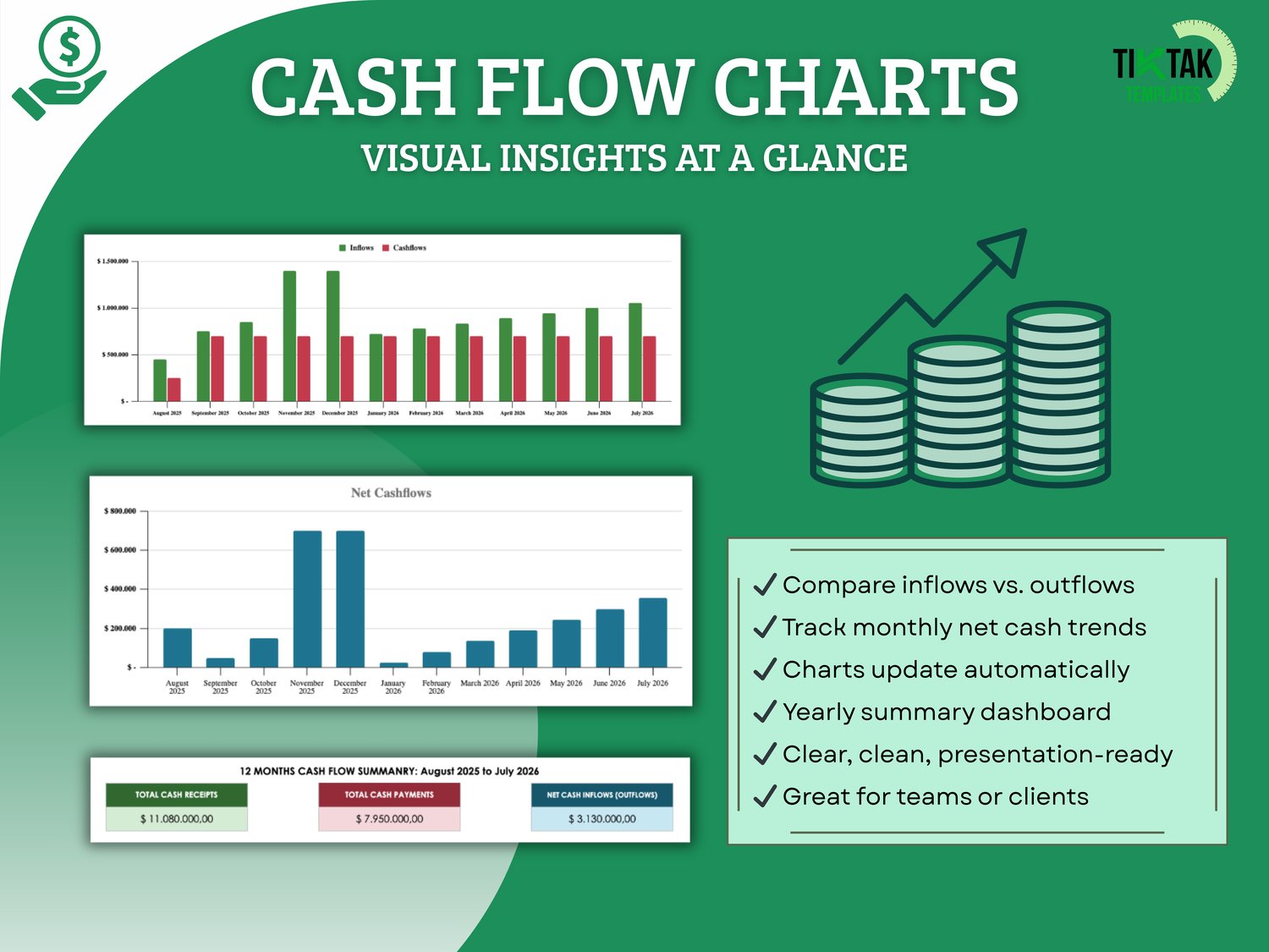 This Cash Flow Tracker helps you monitor monthly and yearly inflows and outflows with dynamic charts, color-coded tables, and auto-calculated summaries. Ideal for freelancers, entrepreneurs, small businesses, or personal finance.