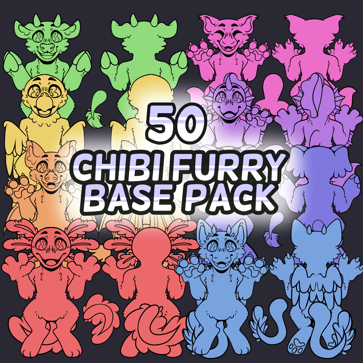Whether you’re looking to create your next main character, design a batch of adoptables or just need a clean canvas to practice your colouring, this 2 Sided Chibi Furry Base Pack is designed to give you a professional, high-quality head start. Skip the "sketch struggle" and jump straight into the fun part: the colours!