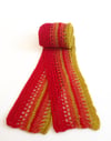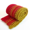 This is a simple, fun design which plays with stripes of trebles and half trebles that run vertically down the length of the scarf. Here I’ve used a spicy combination of colours for a really bold look but it’s great way to use up small amounts of Fiuingering weight and would also work well in a mix of cooler shades.
