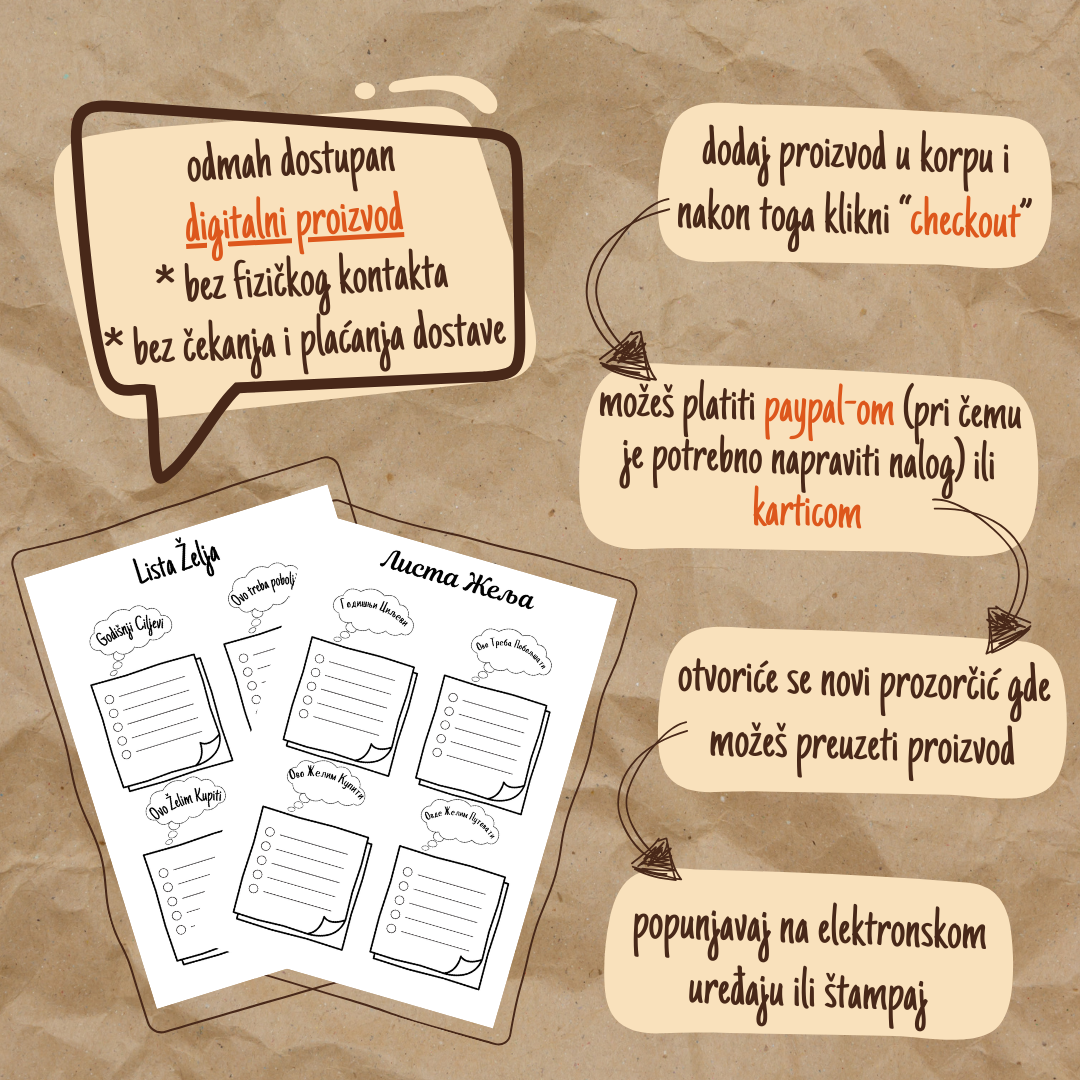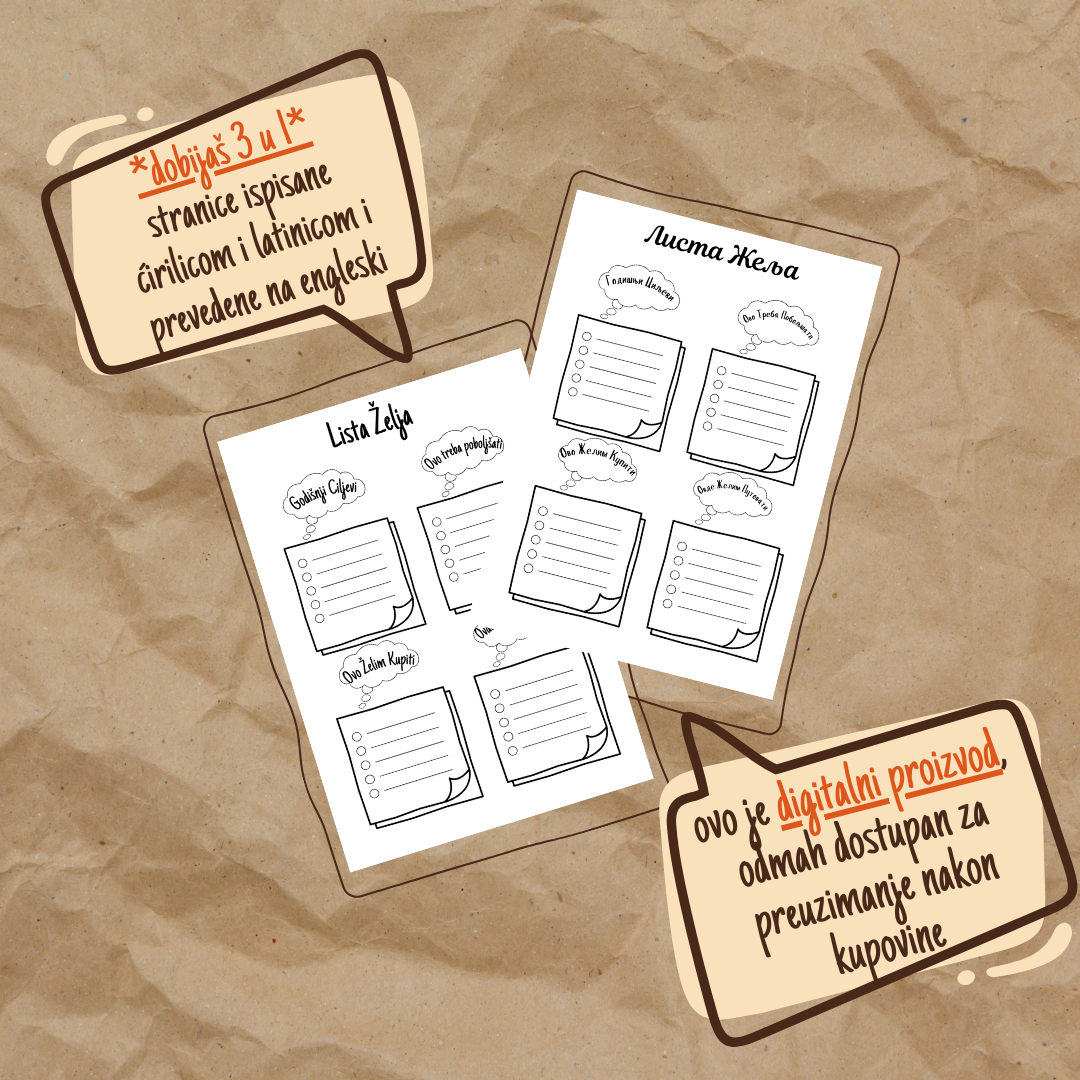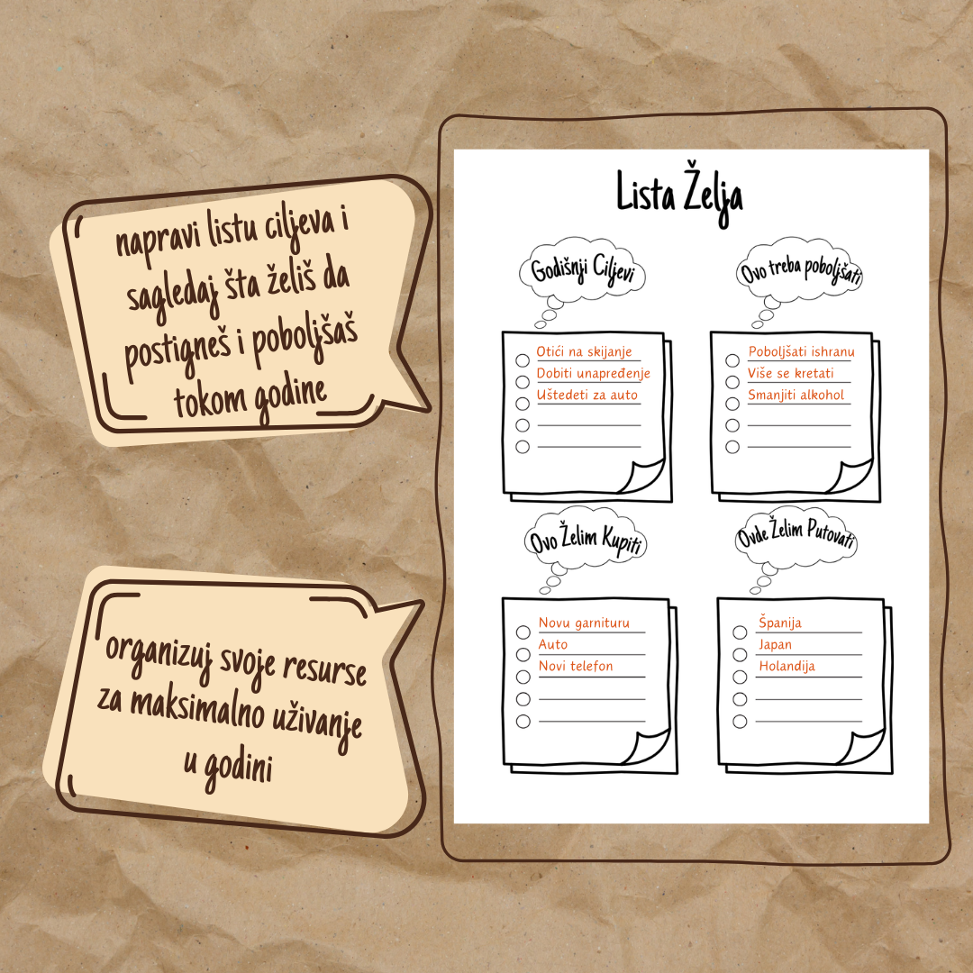 Lista Želja: Postavi i ostvaruj svoje godišnje ciljeve pomoću ove sveobuhvatne liste želja. Navedite svoje aspiracije, uključujući stvari koje želiš da ispuniš, poboljšaš, stvari koje želiš da kupiš, i putovanja na koja želiš da odeš. Za bolji fokus i inspiraciju, osvrni se na ovu listu u toku godine.
