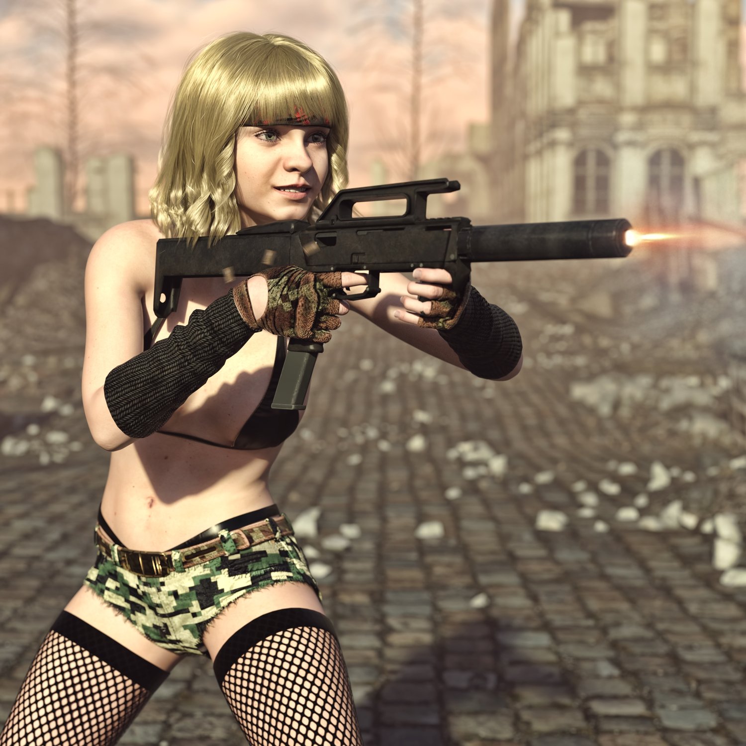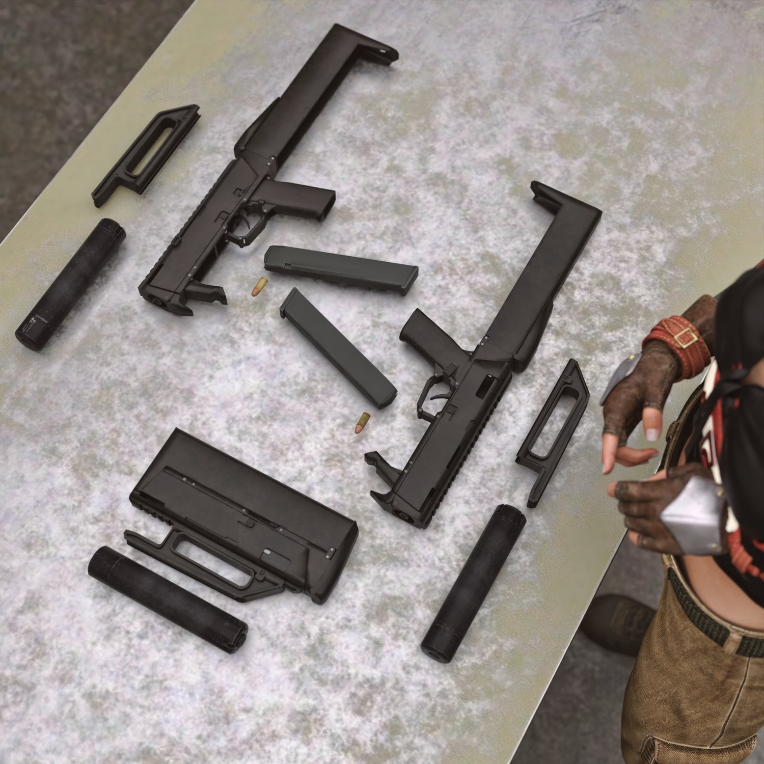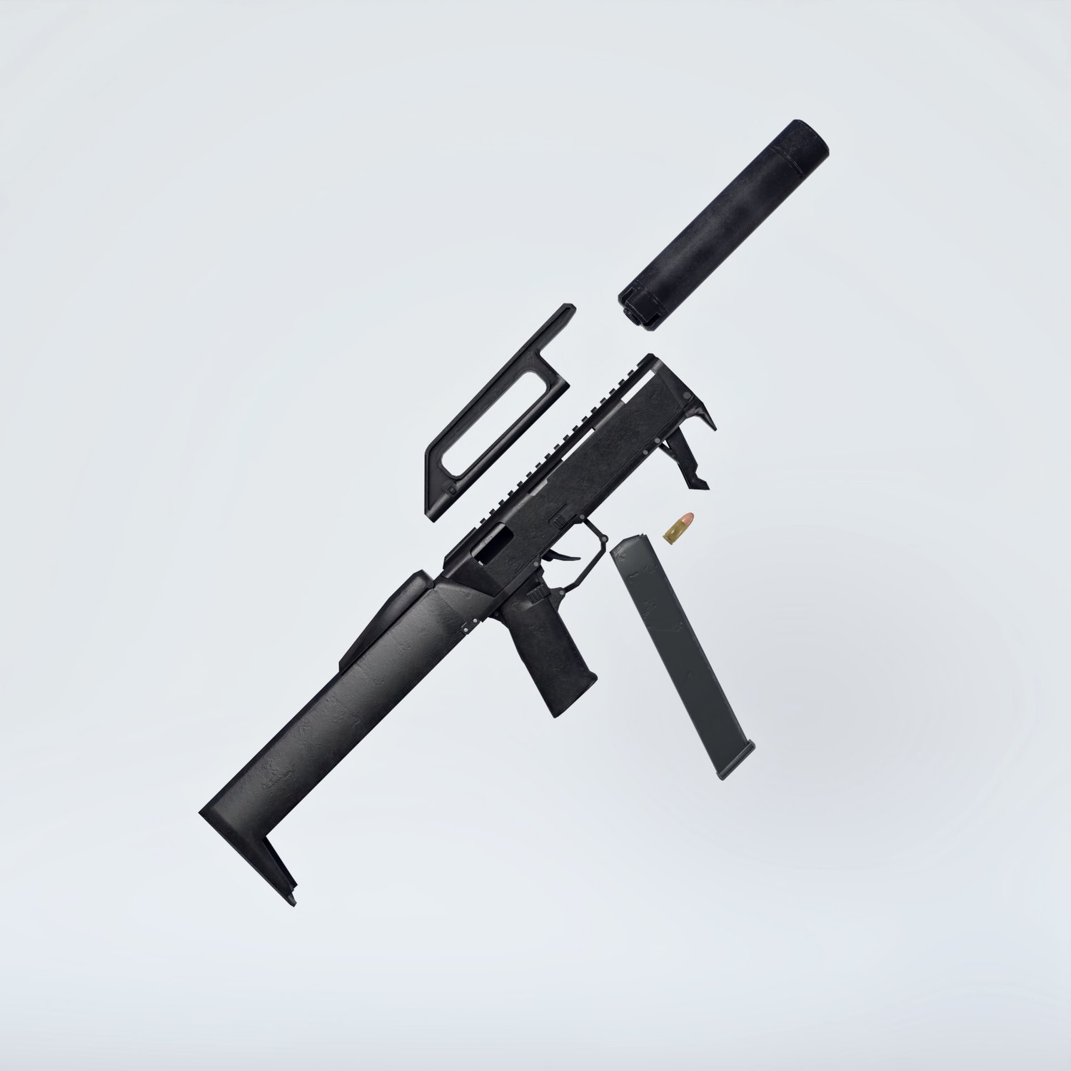 Compact and cool folding submachine gun, for covert operations and spy missions. The gun folds into a small squarish package while all the parts are inside. includes a carry handle and a silencer. The mag is also rigged so can be hidden or manipulated. Converted and rigged for use in Daz, so you can make more realistic pictures, with moving slide, pulled trigger etc.