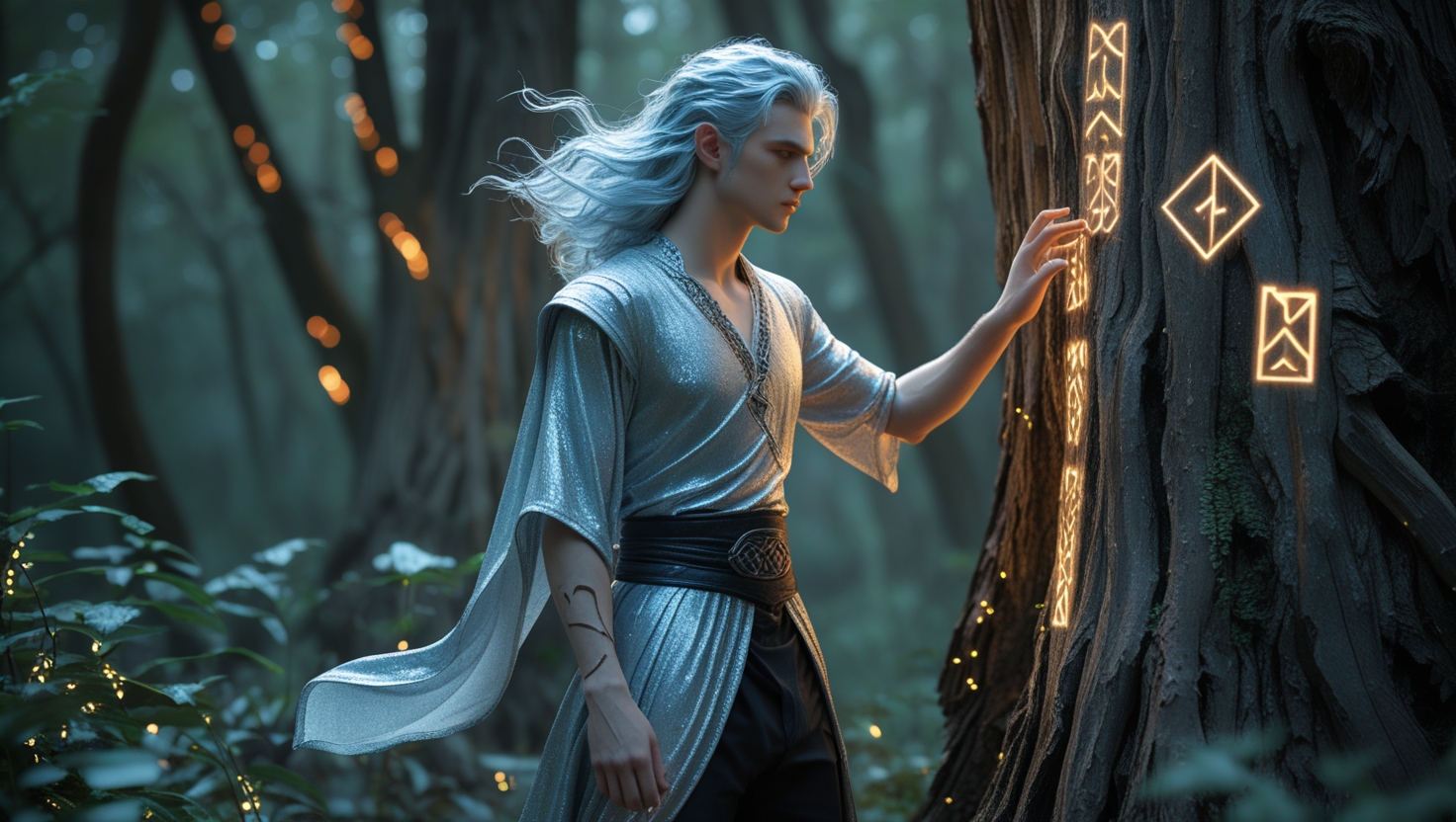 Echo Tree representa a Thalion en conexión con un árbol mágico ancestral, tallado con runas brillantes. La escena fusiona naturaleza mística y sensibilidad emocional en una composición poderosa.