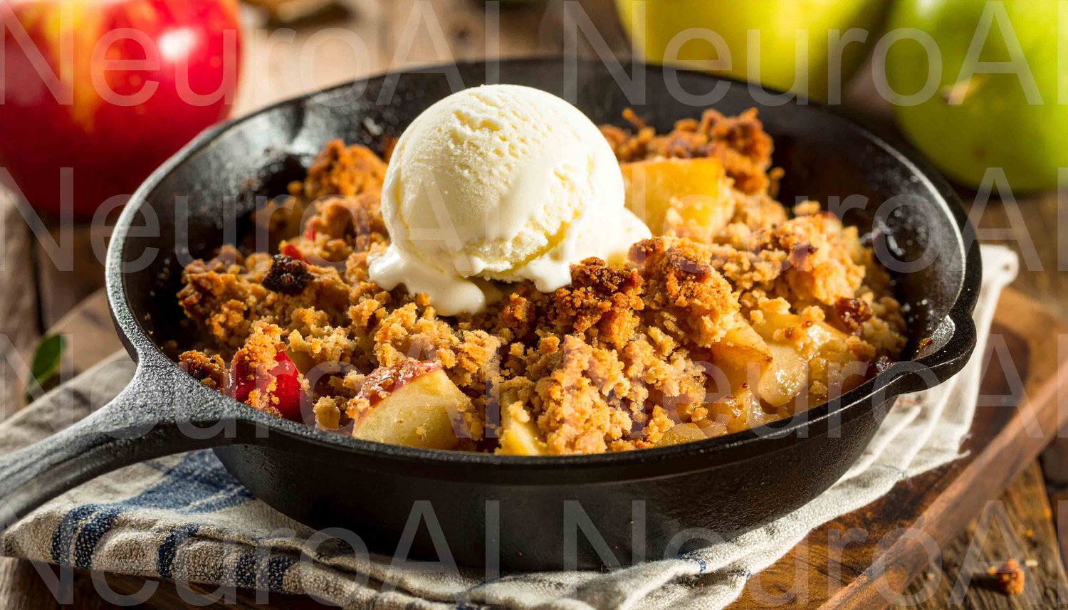 Warm apple crumble with melting vanilla ice cream in cast iron