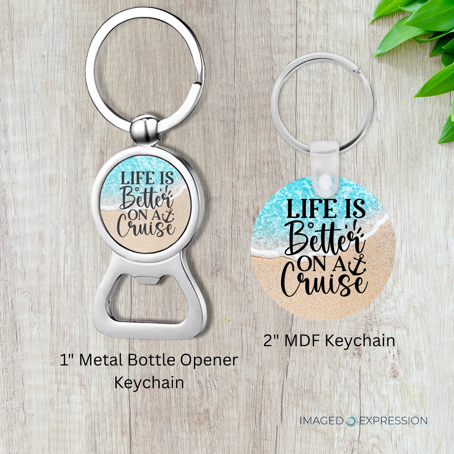 Keychain options: Bottle Opener Keychain are metal and have a 1" image. Round Keychains are made of MDF and are 2". Great for everyday use and make great gifts.