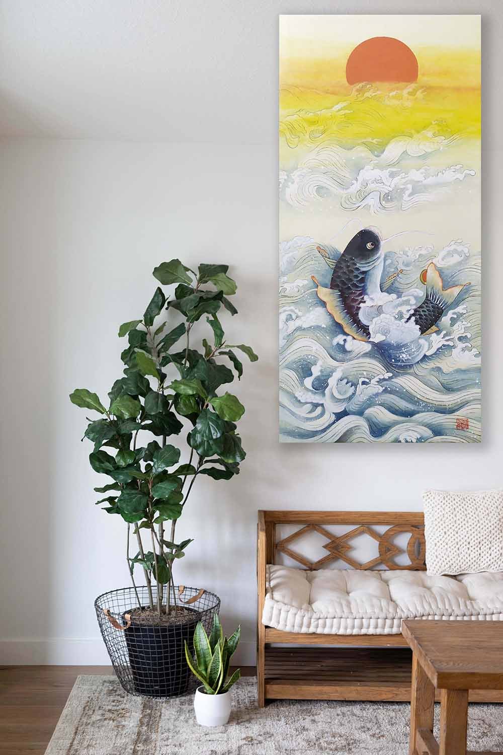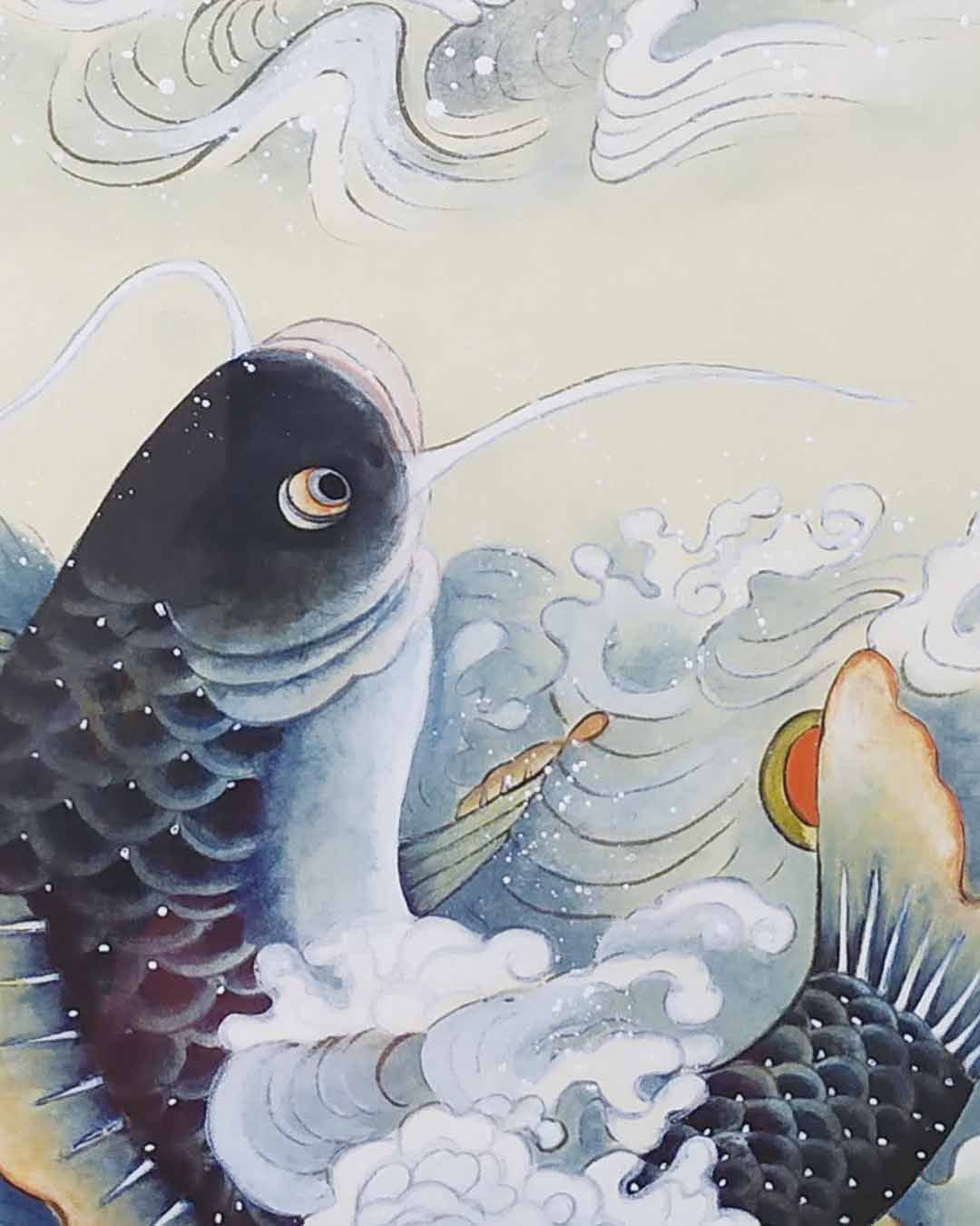 In folk paintings, fish paintings contain the honest and simple dreams of the people who tried to achieve their realistic desires. The picture of a carp kicking and jumping out of water is called 'Eobyeon Seongryongdo'. This is compared to the appearance of a carp springing up and turning into a dragon, in the past, passing the state examination and becoming a government official.