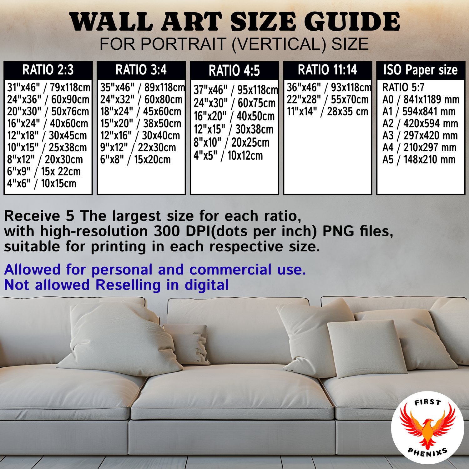 Purchase our digital wall art, and you'll receive a PDF link to download a total of 15 high-quality images (300dpi). These images are variations of the 3 unique designs you see on the cover. Each of these designs is provided in 5 different sizes, ensuring versatility for your printing needs: