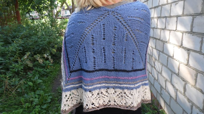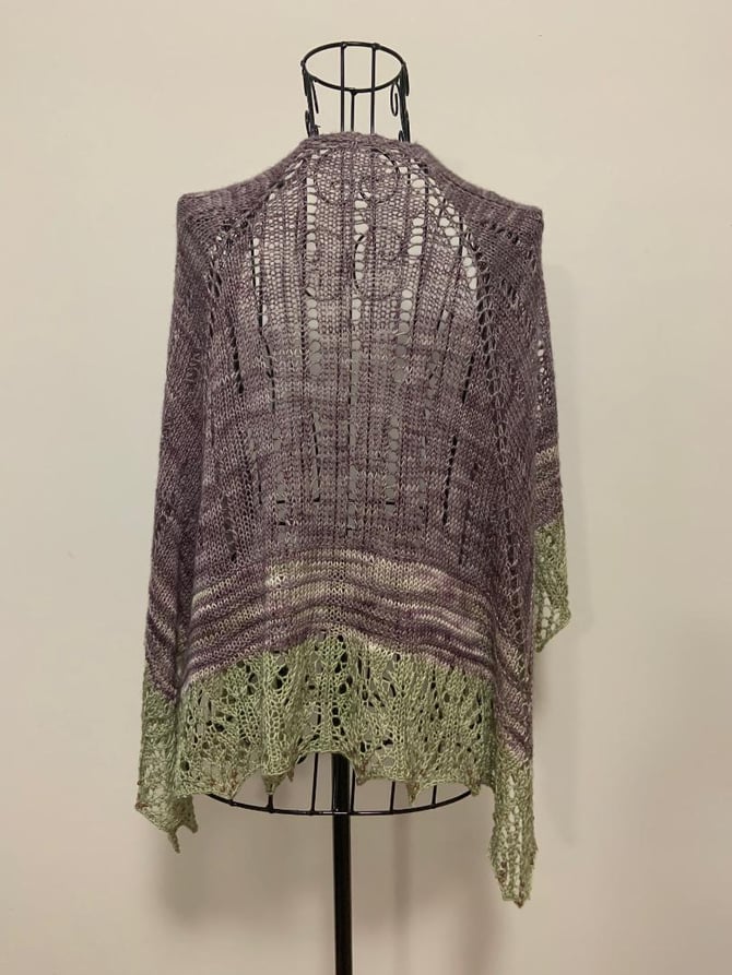 It is knit top-down in a three-quarter square shape that stays securely over your shoulders. There is no lace patterning on WS rows - perfect for peaceful knitting. Choose between 3 sizes - small (shawlette), medium and large (see tester photos).