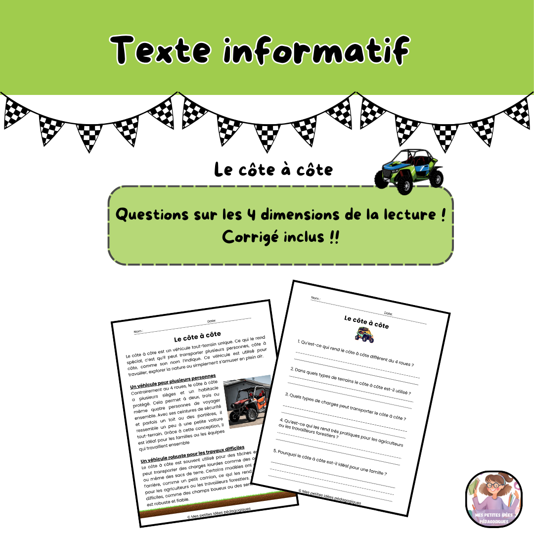 Voici 8 textes informatifs de 2 pages sur divers véhicules (Formule 1, NASCAR, motoneige, pelle mécanique, 4 roues, côte à côte, tractopelle, voiture électrique)