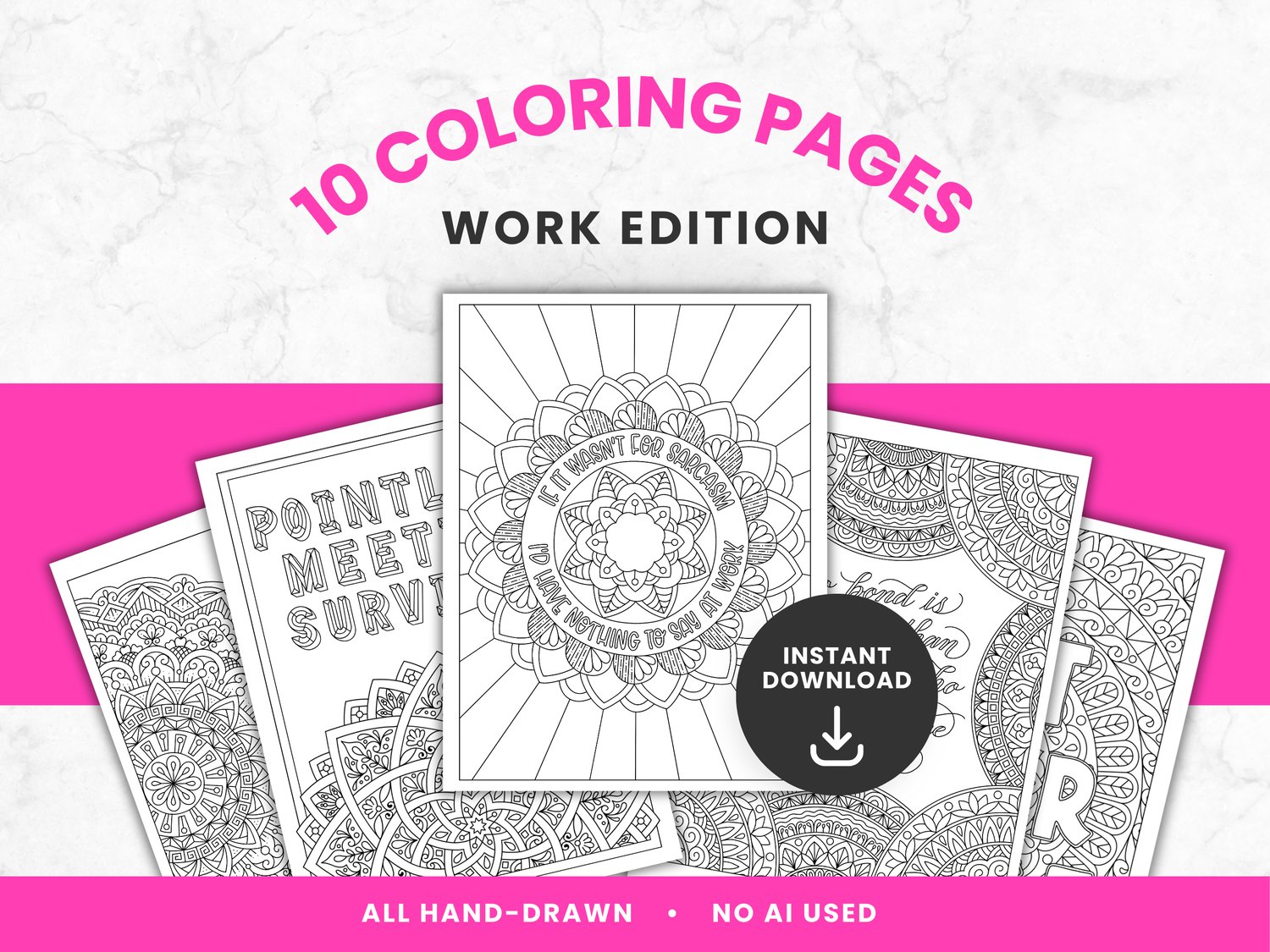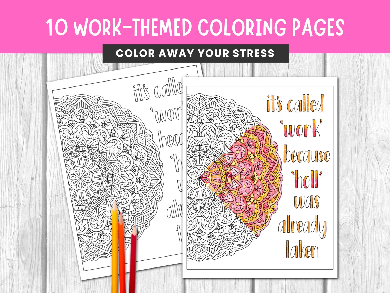 This sarcastic, office-themed adult coloring bundle is designed for anyone surviving meetings that should’ve been emails and coworkers who test your patience daily. Each page combines mandala-style line art with witty, relatable workplace phrases to help you decompress without getting fired.
