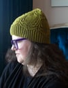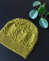 This richly textured hat features elegant leaves, crisp half-twisted ribbing, and contrasting seed stitch. The leafy motifs combine the occasional cluster stitch, two-stitch cables, and simple lace, but in any round you will only need to use one of these techniques so it’s simpler than it sounds. To complete the set, the companion patterns Greenery Cowl and Greenery Mitts are available separately.