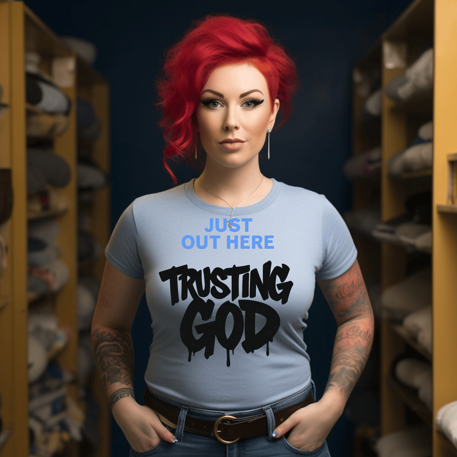 This bold faith-based design features the powerful phrase “Just Out Here Trusting God” in a clean, modern layout with a drip-style graffiti font for added edge. Perfect for making your own t-shirts, hoodies, mugs, totes, decals, and more!