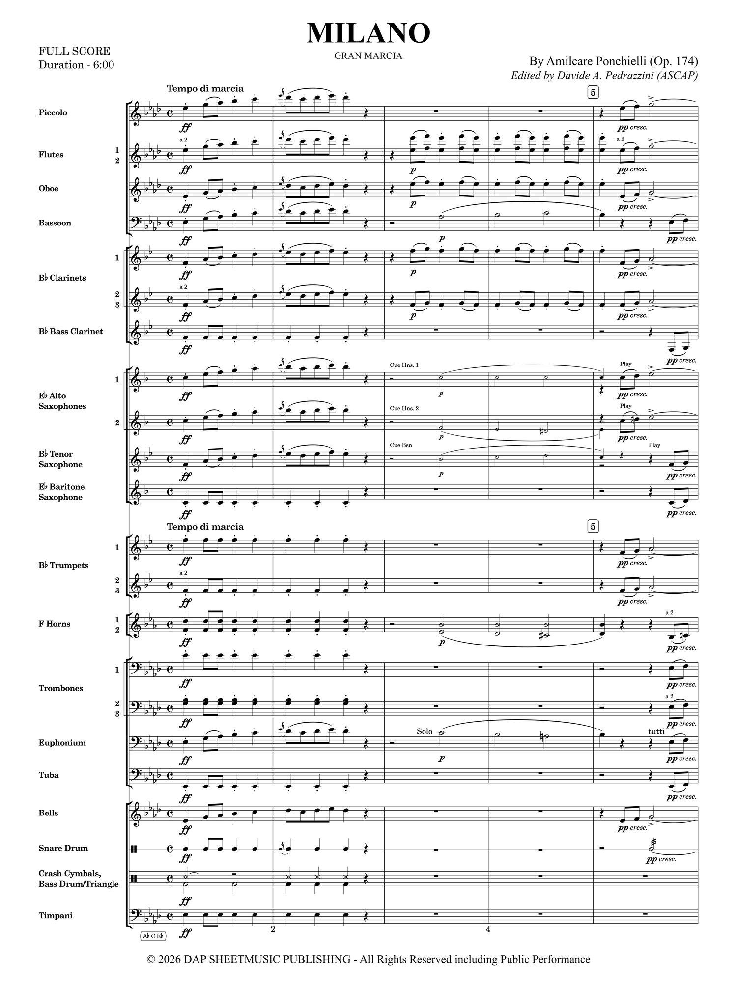 La marcia MILANO si inserisce in questo contesto: un brano concepito per le bande dell’epoca, legato alla funzione civile e celebrativa della musica per banda, e caratterizzato da una scrittura chiara, solida e immediatamente comunicativa. La forma tradizionale, l’uso incisivo del ritmo e il frequente ricorso a raddoppi strumentali rispecchiano le prassi esecutive e gli organici bandistici della seconda metà del XIX secolo.